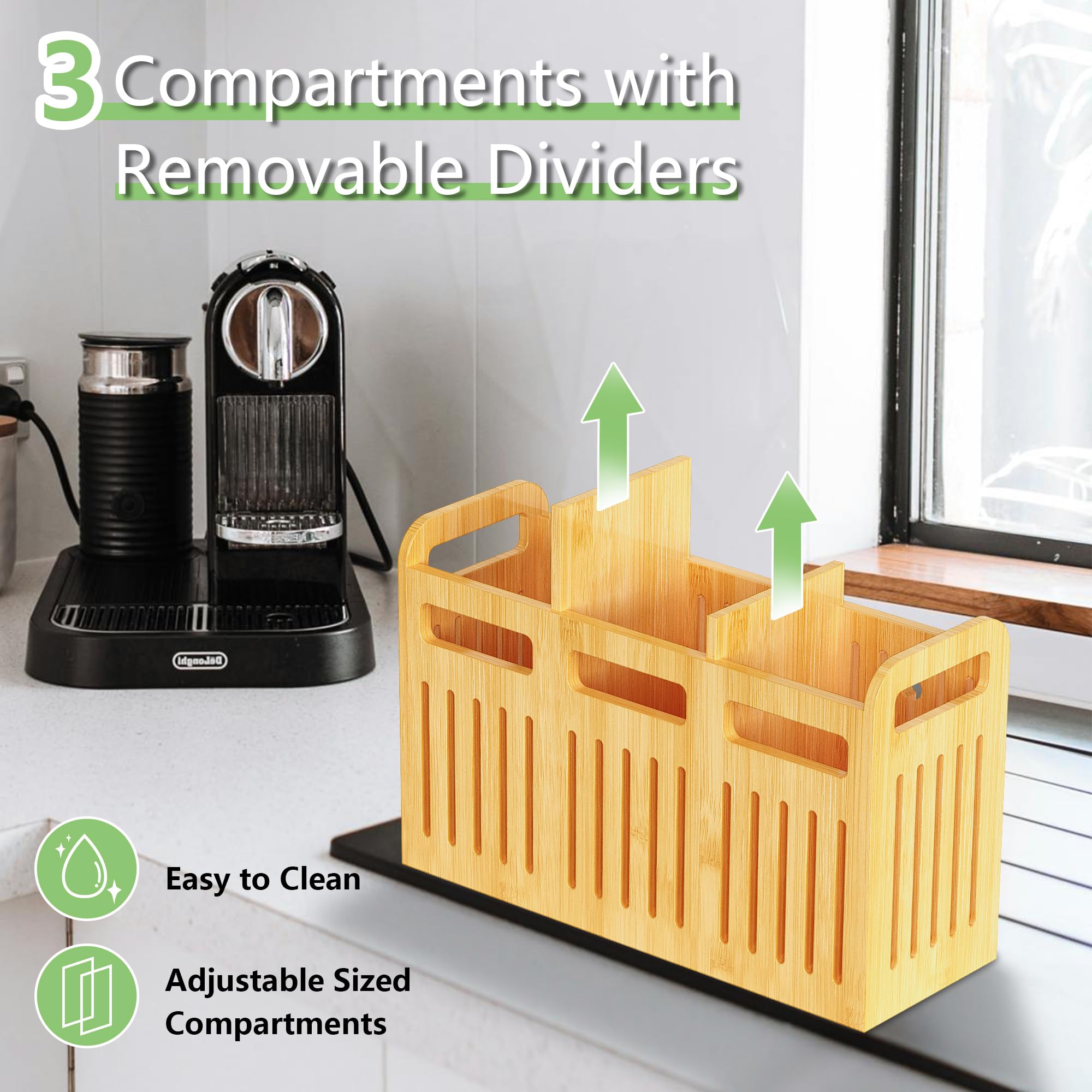 Customizable Compartments: The utensil holder includes 3 compartments with 2 removable dividers, allowing you to customize the layout to suit your utensils. This flexibility ensures everything has its place, while the removable dividers make cleaning easy and maintain hygiene.
