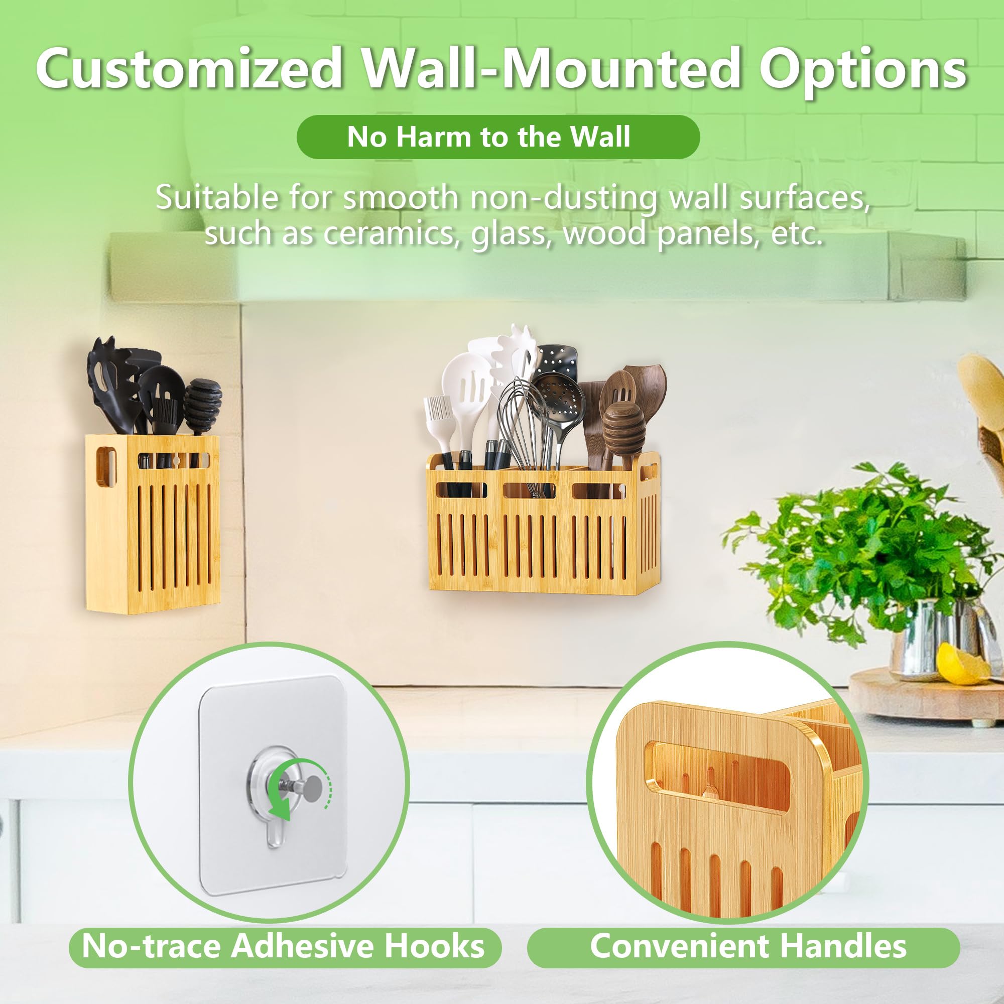 Wall-Mount Option: Crafted from durable natural bamboo, this organizer can be placed on the counter or mounted on the wall using the included traceless adhesive hooks, saving space while maintaining stability.