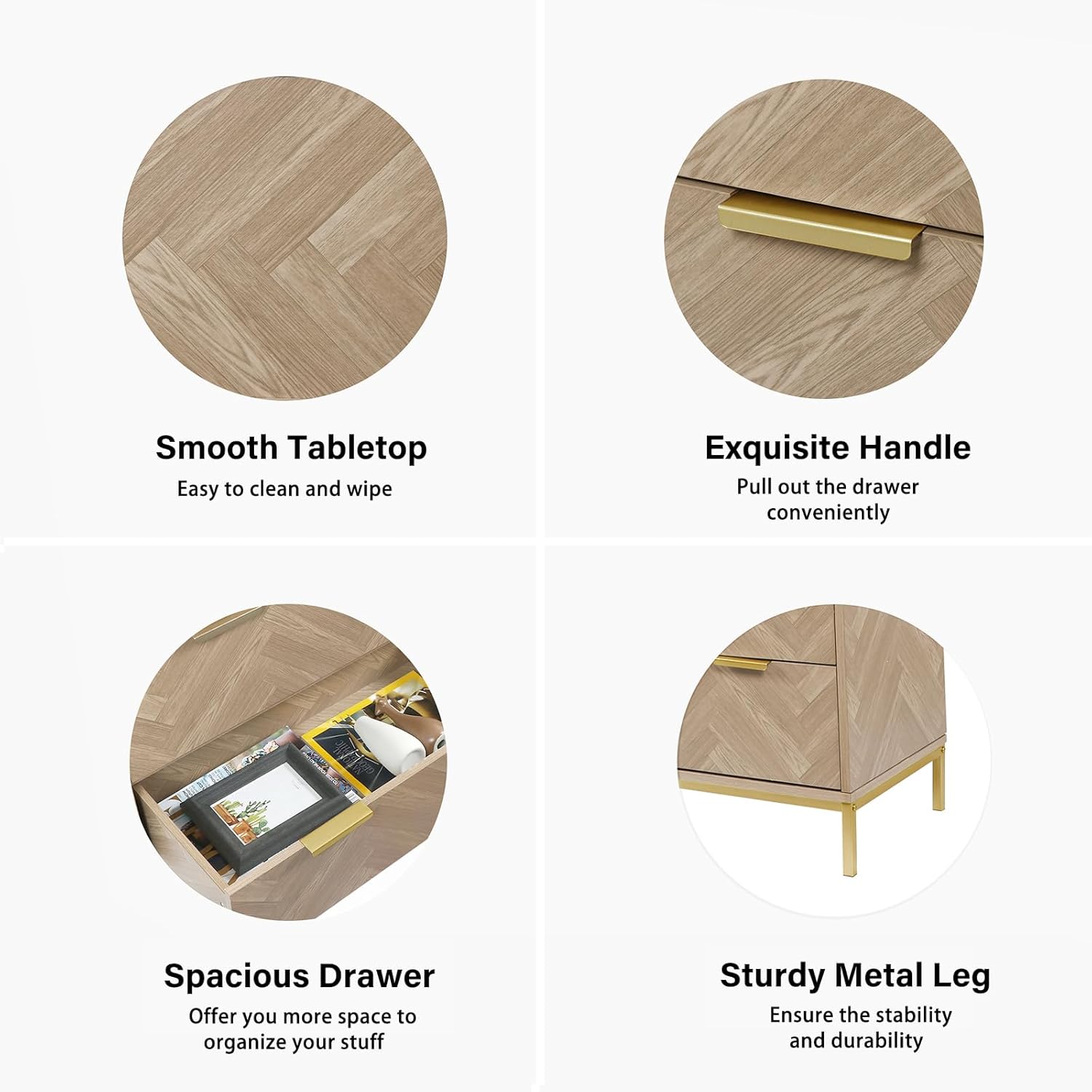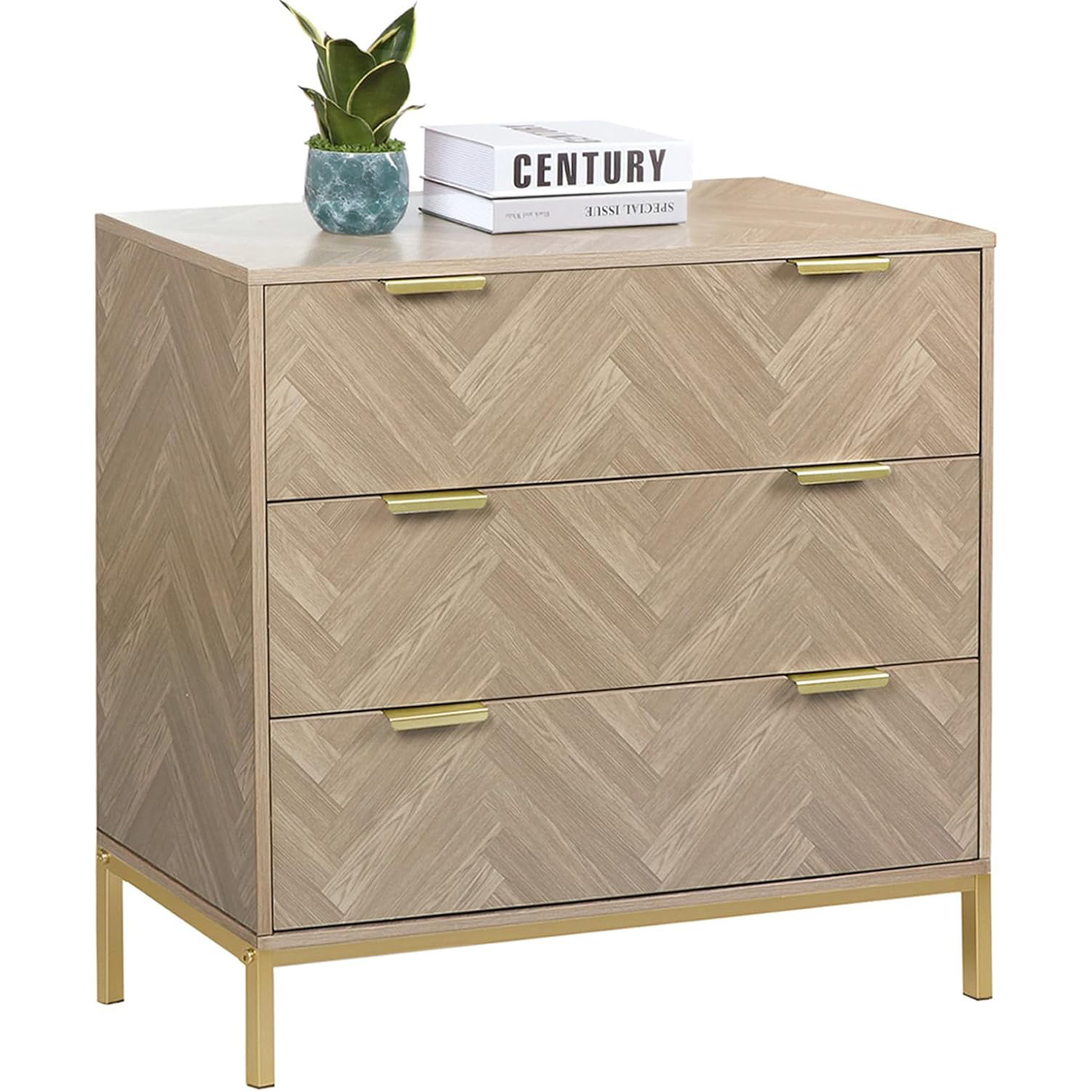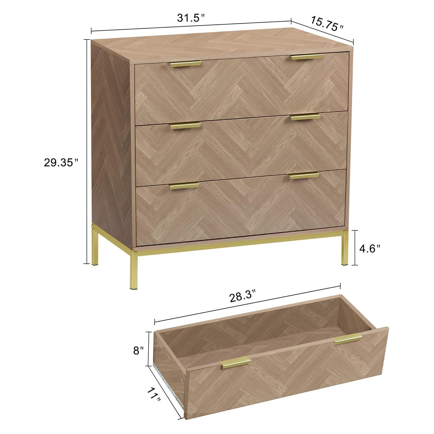 * HANDCRAFTED:The dressers creates a truly vintage and unique piece of accent furniture. The three-drawer chest is completed with symmetrical heringbone pattern drawer and classic gold metal handle.