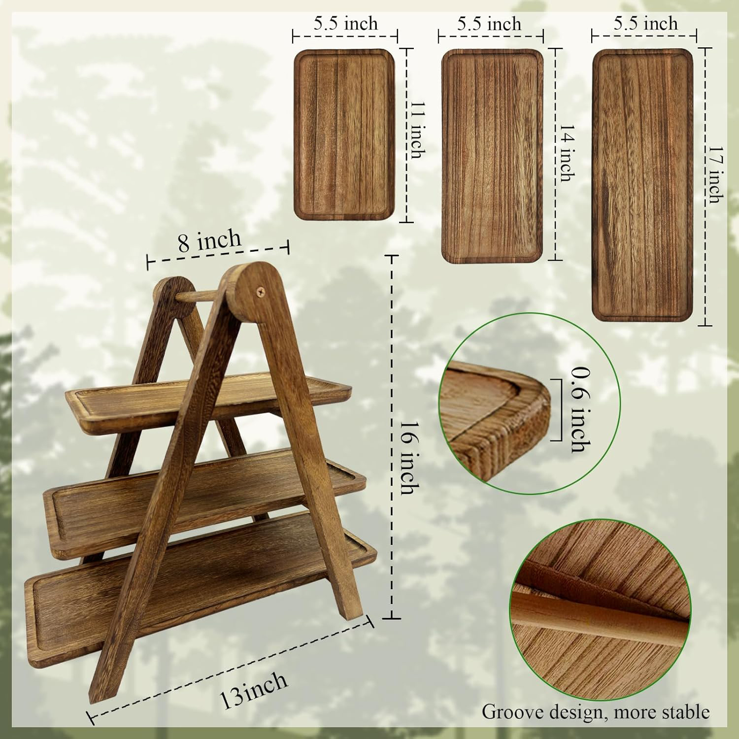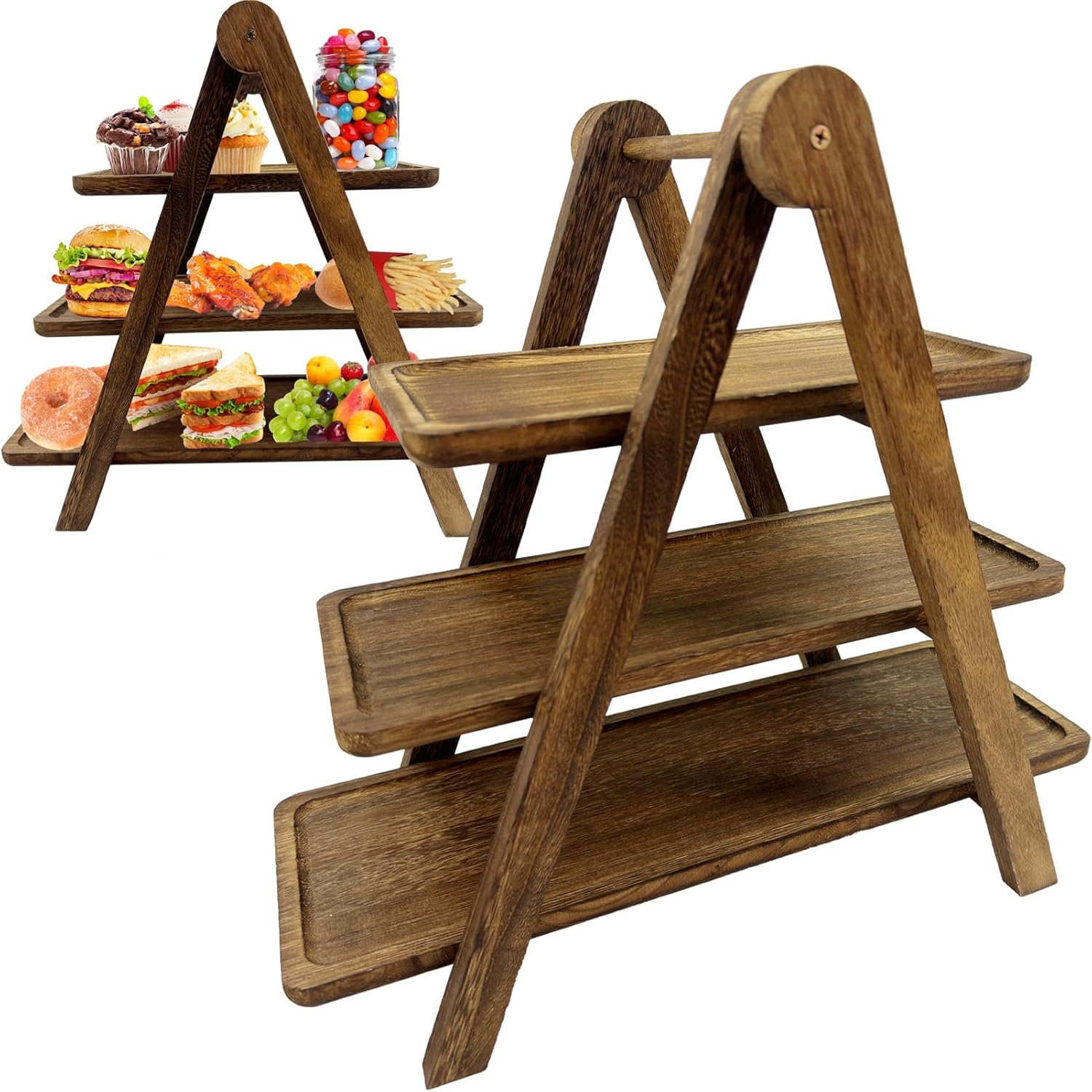 Material: Our wood 3 tier serving trays are made of natural wood simply wash with water and fold for storage