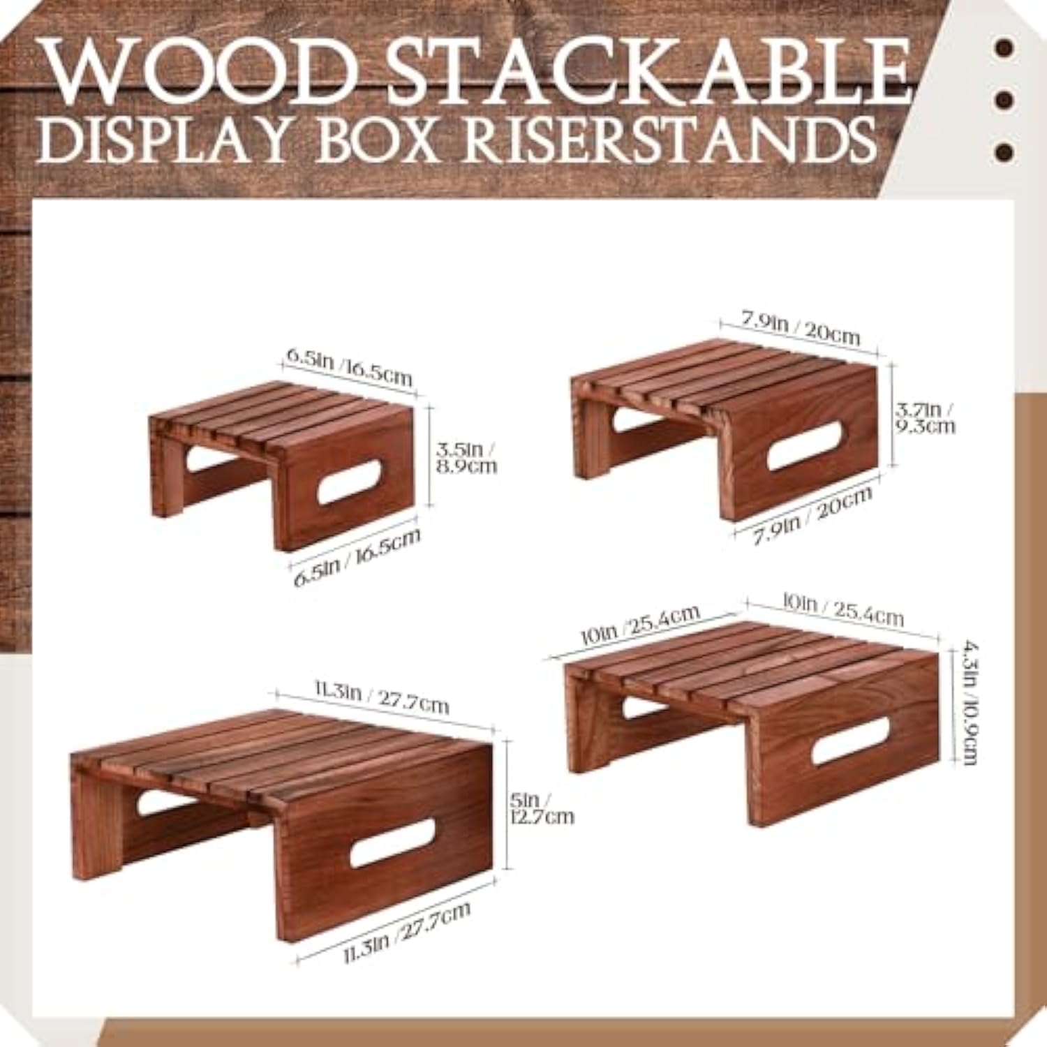 Rich Size Varieties: these square wooden cake stands offer a variety of sizes, namely about 6.5 x 6.5 x 3.54 inches, 7.87 x 7.87 x 3.74 inches, 10 x 10 x 4.25 inches and 11.42 x 11.42 x 5 inches, which cater to different needs for dessert display, ensuring most cakes, regardless of size, get the proper places; You can also stack them for space saving when not in use