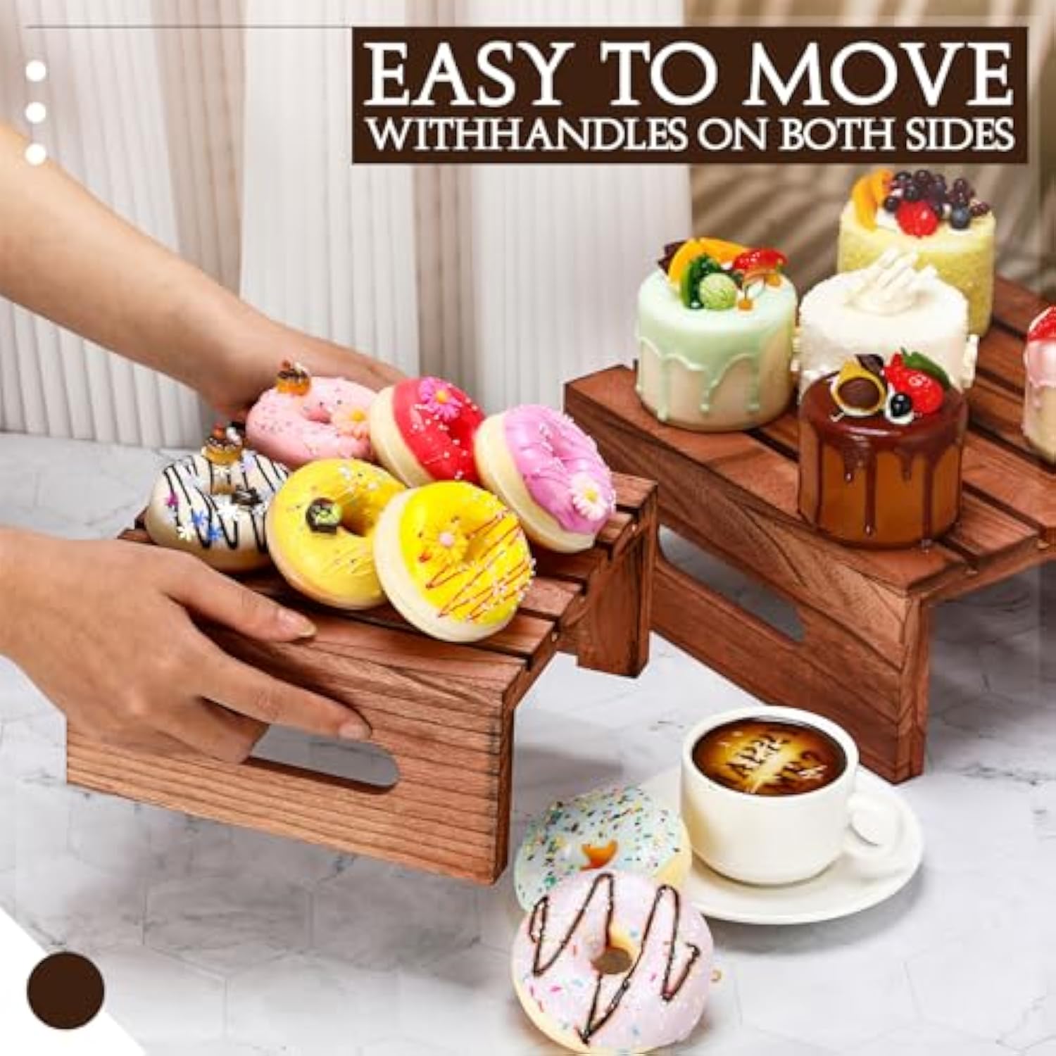 Credible Wood Material: this cake dessert display with handles is made of quality wood with natural textures that enliven your settings; The smooth and sturdy surface is not only attractive but also ensures a steady platform for your baked creations; Plus, the easy to clean surface keeps your food clean and maintenance effortless