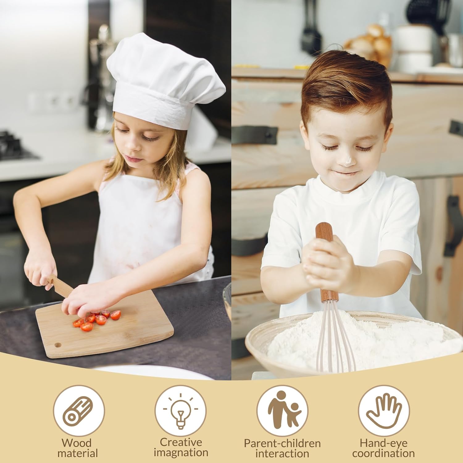 Ability Training:Together with your kids both enjoy healthy food cooking and exercise their hands-on skills. Our montessori kitchen tools/toddler cooking set is perfect for kids beginning cooks. This toddler safe knife has wood textures also compact and lightweight which helps children to develop an interest in cooking.