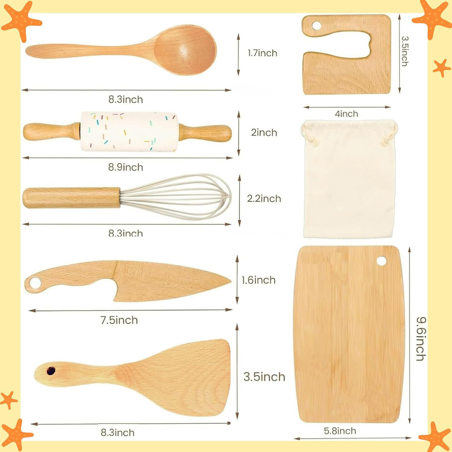 8pcs Wooden Kids kitchen set for little chefs:Our kid safe cutting knives includes different styles of kids knives*2 cutting board*1 Egg whisk*1 spoon*1 rolling pin*1 Wooden shovel * 1 storage bag * 1.A variety of toddler knives can increase the fun of children's design, this kids knife set for real cooking suitable for cooking with family.