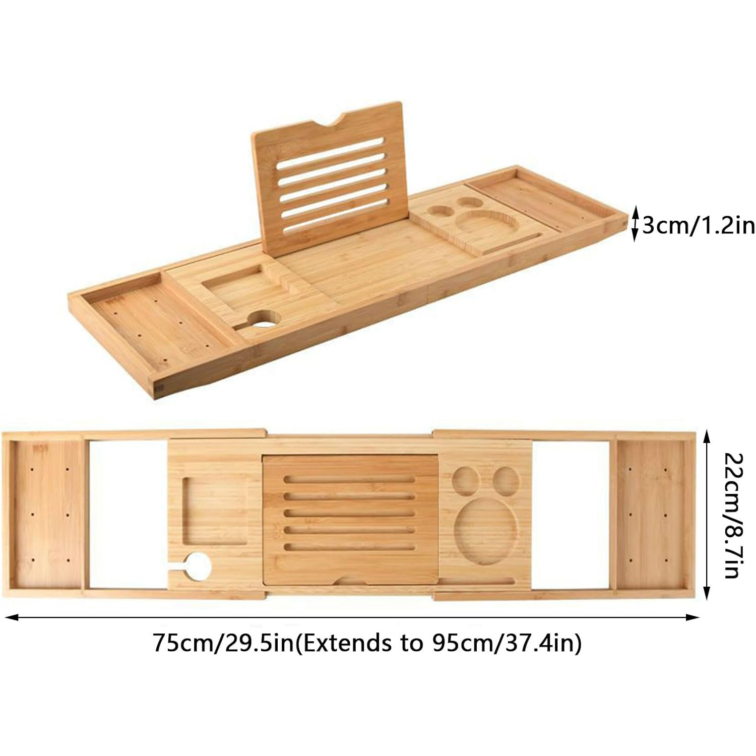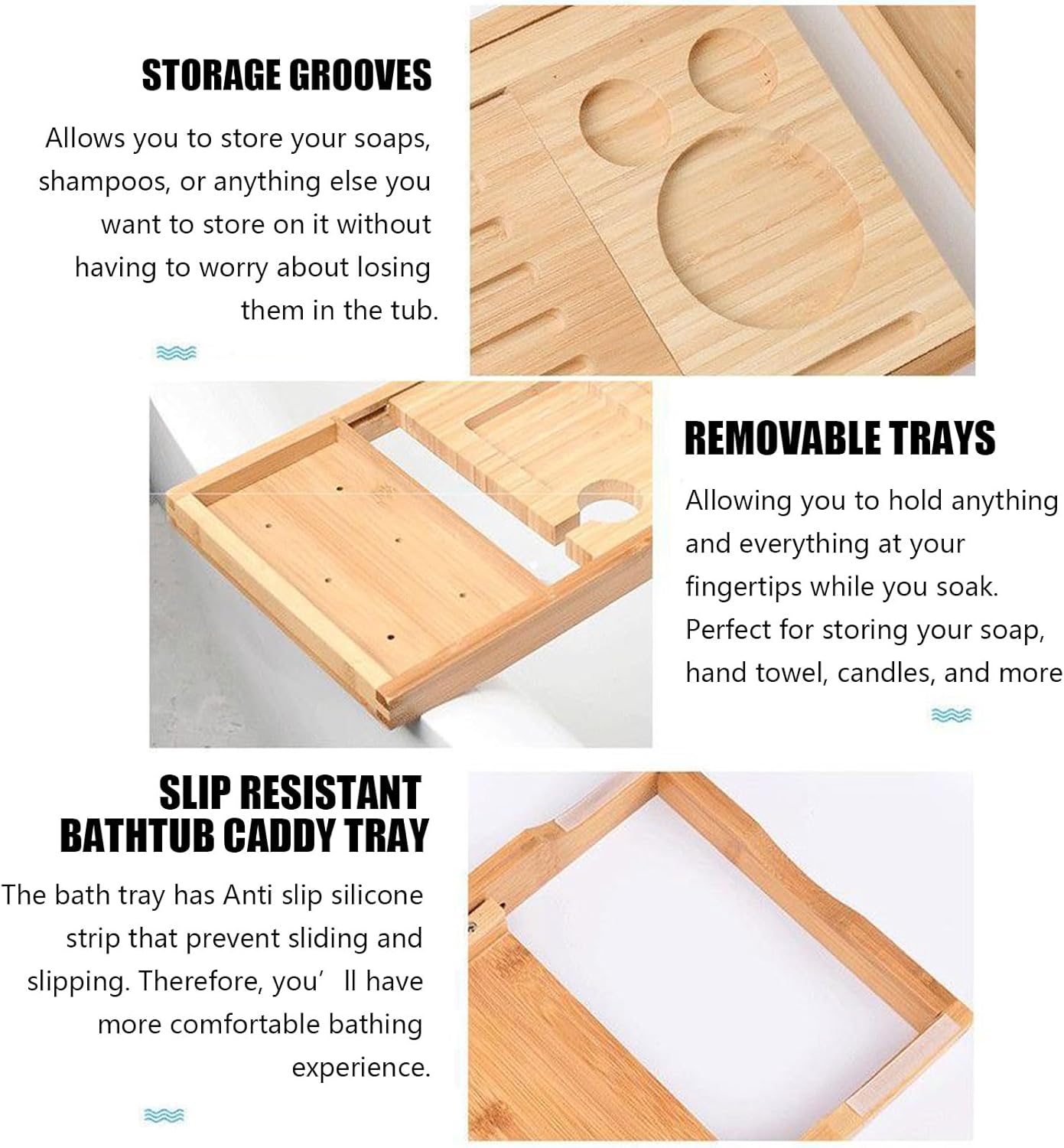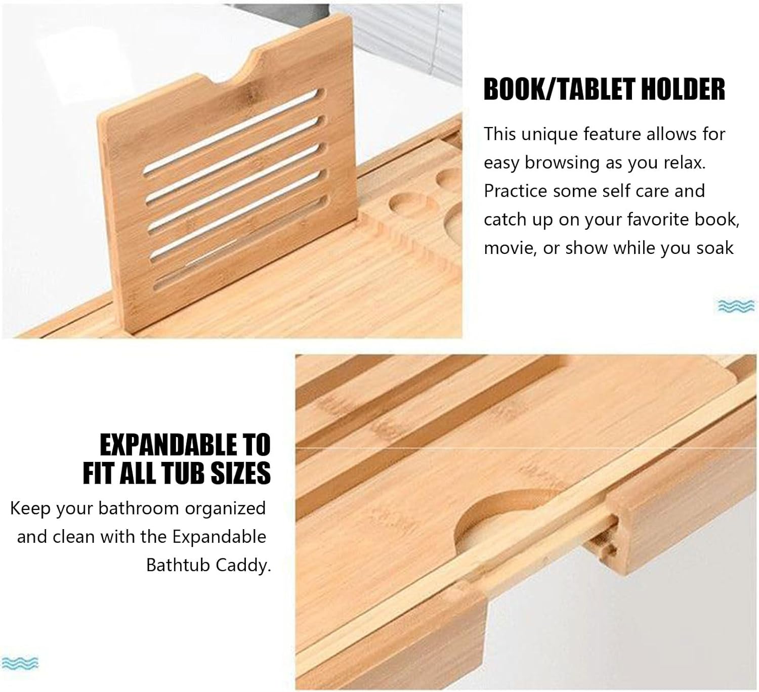DIVERSE COMPARTMENT: Bath tray with wine glass holder, phone holder, iPad holder, and towel holder; you can still enjoy a good bath without the hassle of reaching for a towel to dry your hands for your book, water or any drink when the phone rings at the most awkward time.