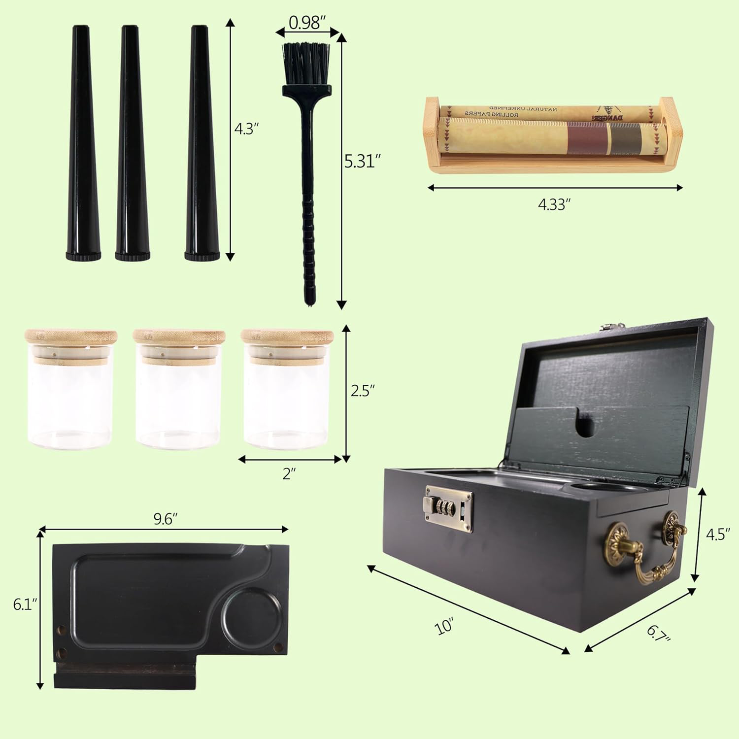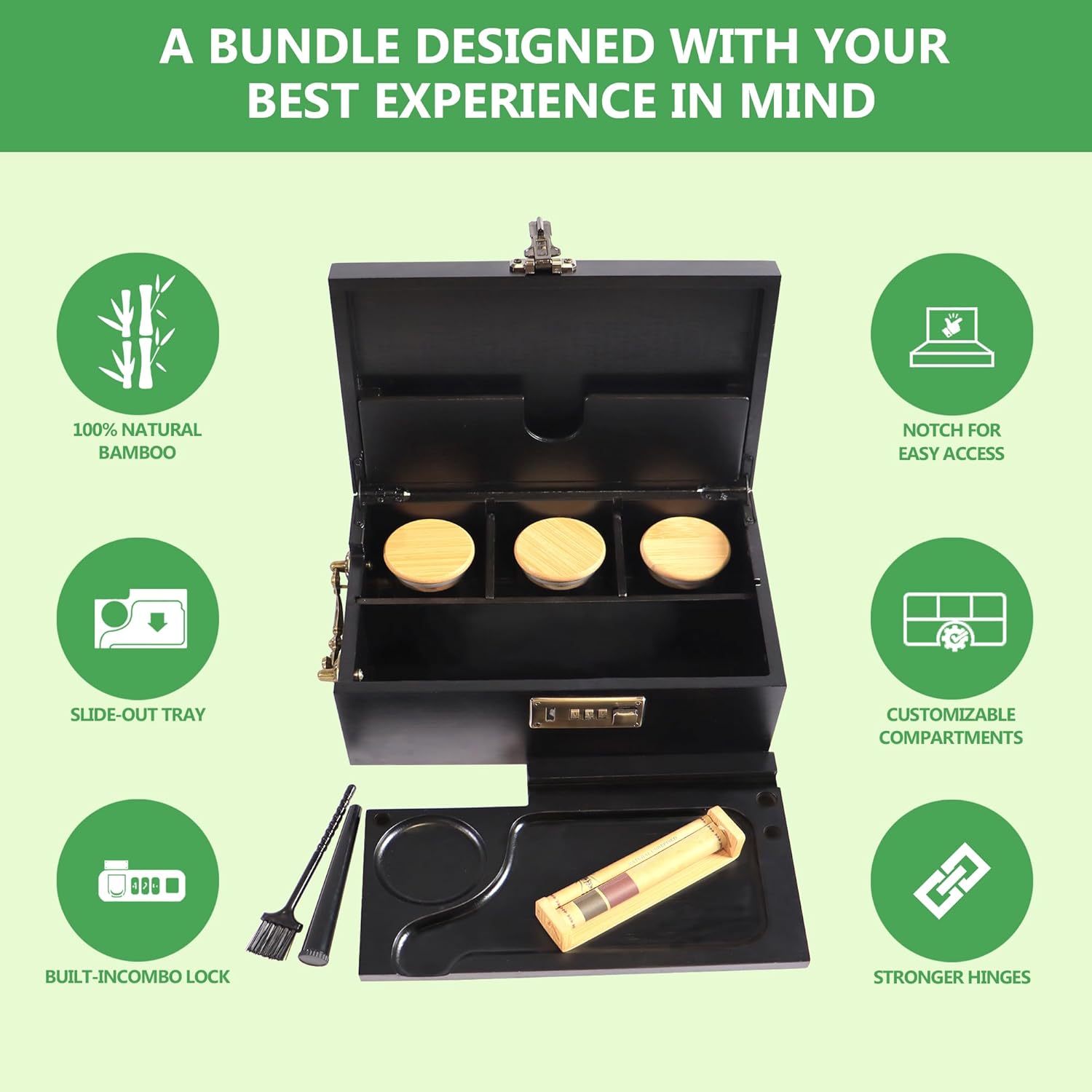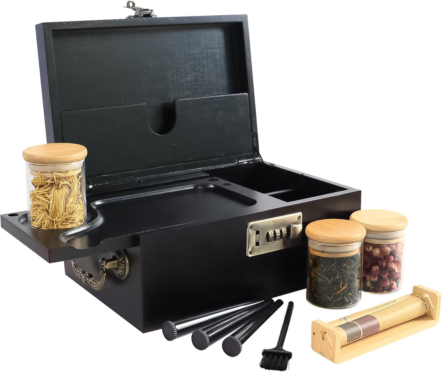 【EXQUISITE BAMBOO BOX TRAY SET】We hooked you up with high-quality accessories to use right out of the box. The Stash Box Set includes 3 glass jars, 3 storage tubes, a removable bamboo tray, a bamboo herb roller and a cleaning brush. The combination lock can ensure privacy, and the side is equipped with a carrying handle to facilitate travel. Enjoy exceptional value for your money.