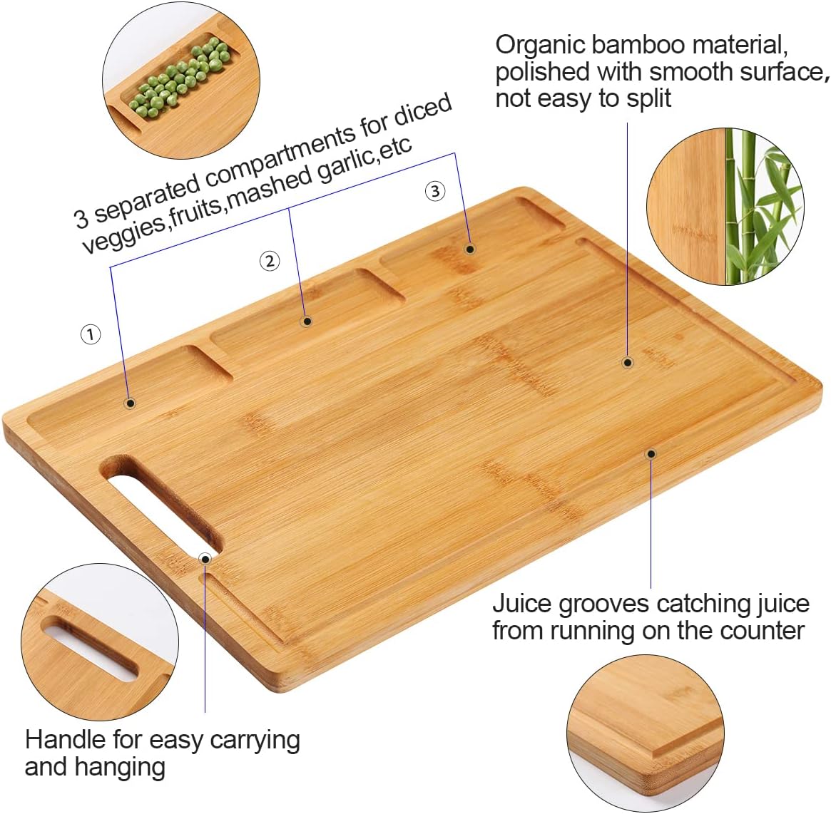 Premium Bamboo: The cutting board is made of natural bamboo. Avoid the growth of unhealthy substances effectively, sturdy, and not easy to split.