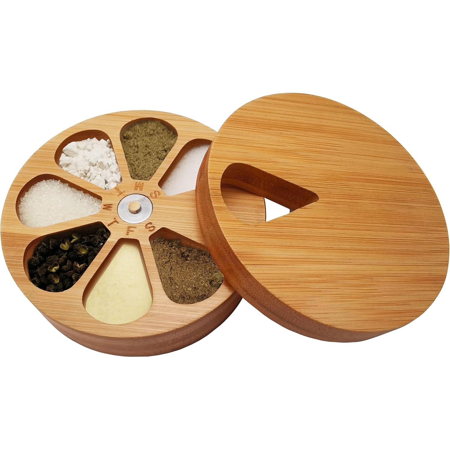Seasonings Box: Large Multi-compartment container store your favorite salts, peppers, sugars, spices or herbs, or favorite seasonings close at hand on the countertop or kitchen table. Beautifully crafted this versatile all natural Bamboo salt box looks stylish on the table and is extremely functional in the kitchen.
