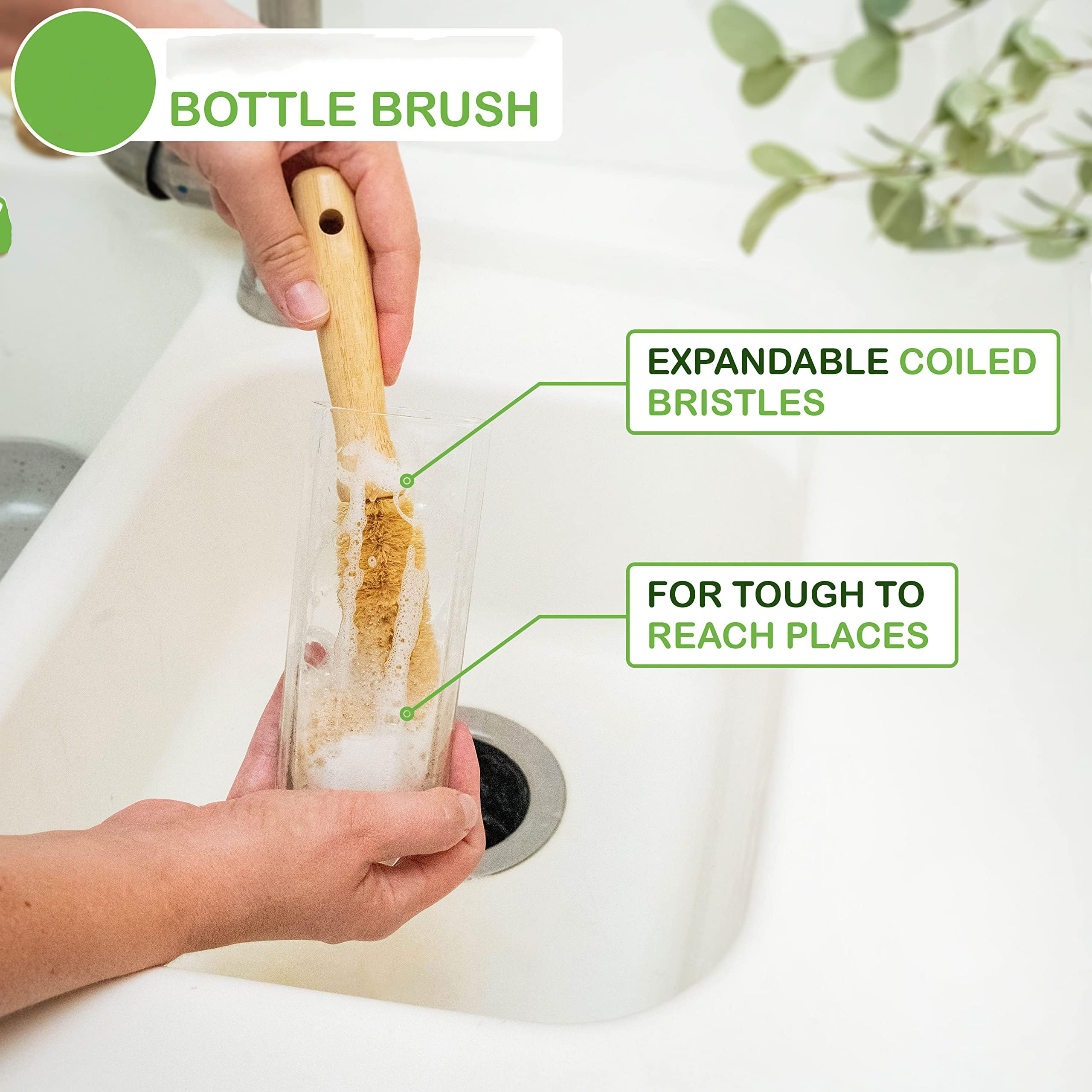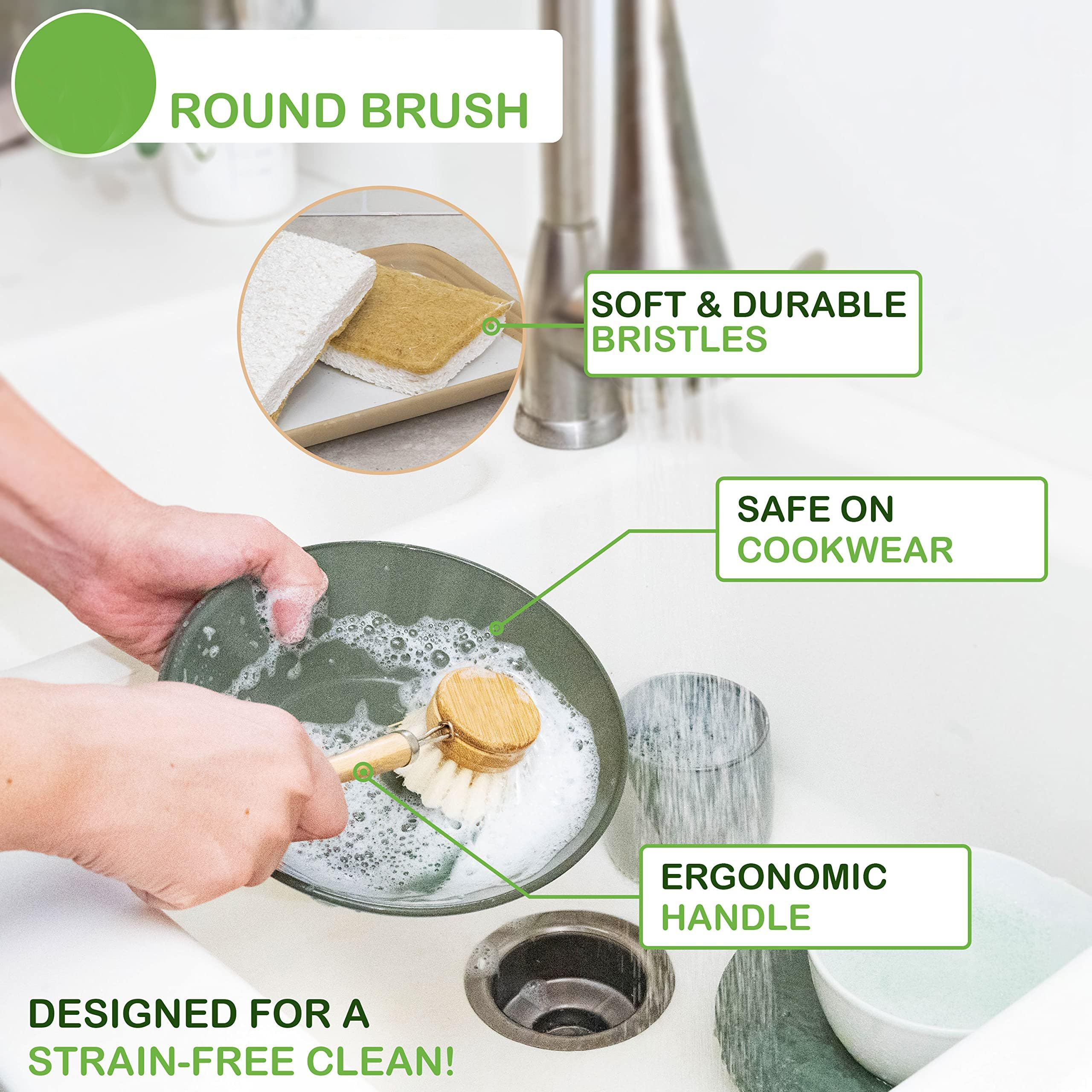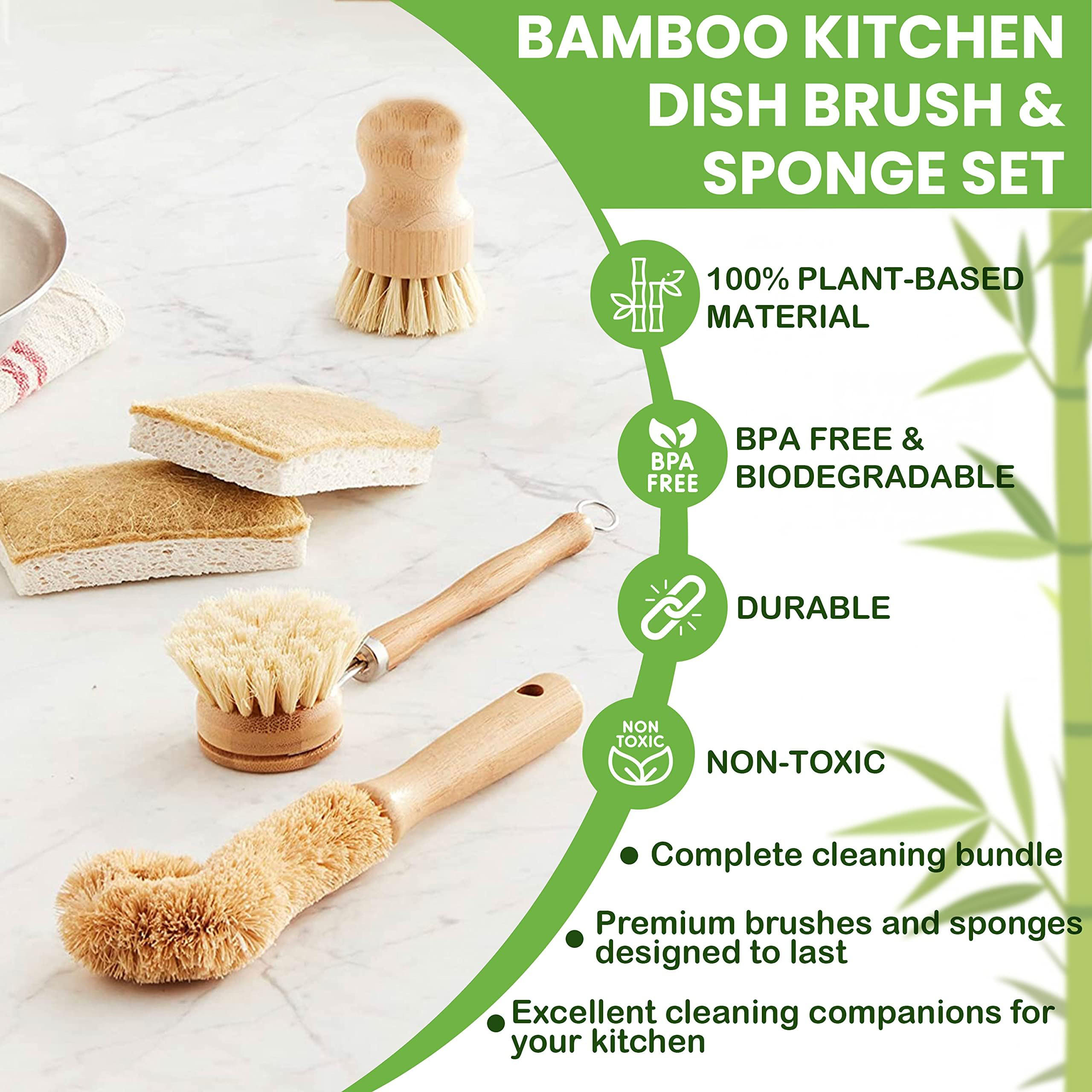 Versatile Brushes and Sponges: Featuring compostable sponges and durable dish brushes, this set is designed for a variety of cleaning tasks. Use the brushes for dish washing or cleaning bottles, while the sponges are perfect for wiping down counters, sinks, and other surfaces.