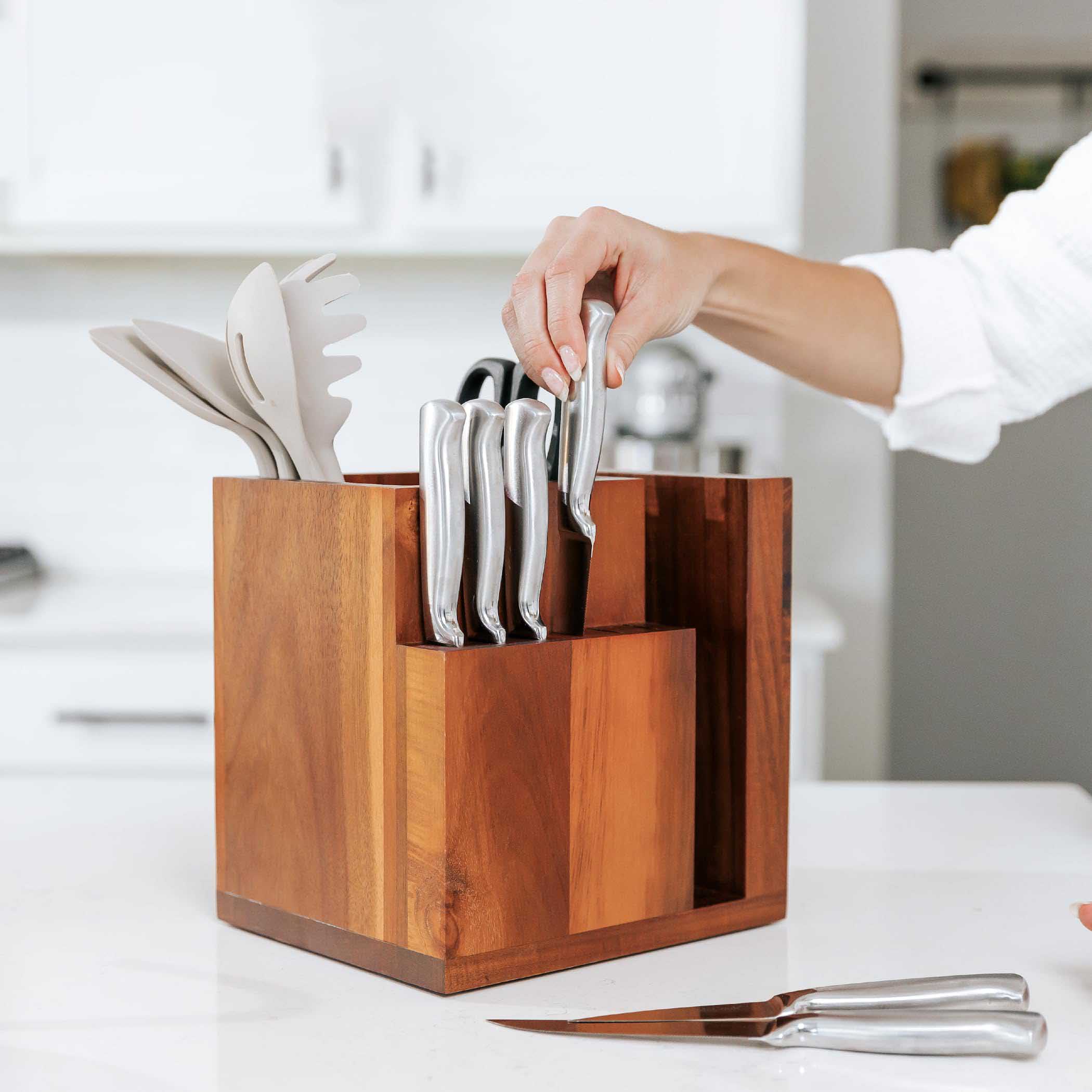 Comprehensive All-In-One Design: This solid bamboo knife block combines elegance and practicality, offering space for 6 steak knives while featuring an integrated utensil holder for spatulas, spoons, and other kitchen tools. Keep all your essentials conveniently within reach.