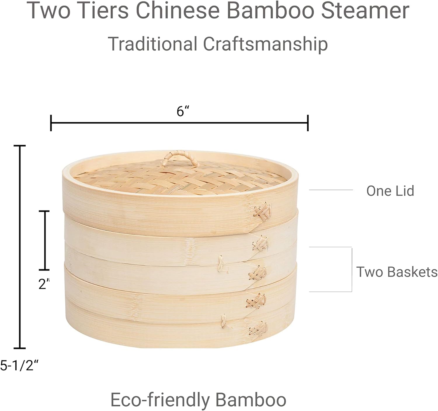 Traditional Craftsmanship: Our Hand Made Traditional Chinese Bamboo Steamer Comes One Lid and Two Basket, Measures 6 inches Diameter and 5-1/2 inches Height, Each Basket Approx 2 inches Deep. The steamers can be stacked on top of each other to cook multiple foods at the same time.