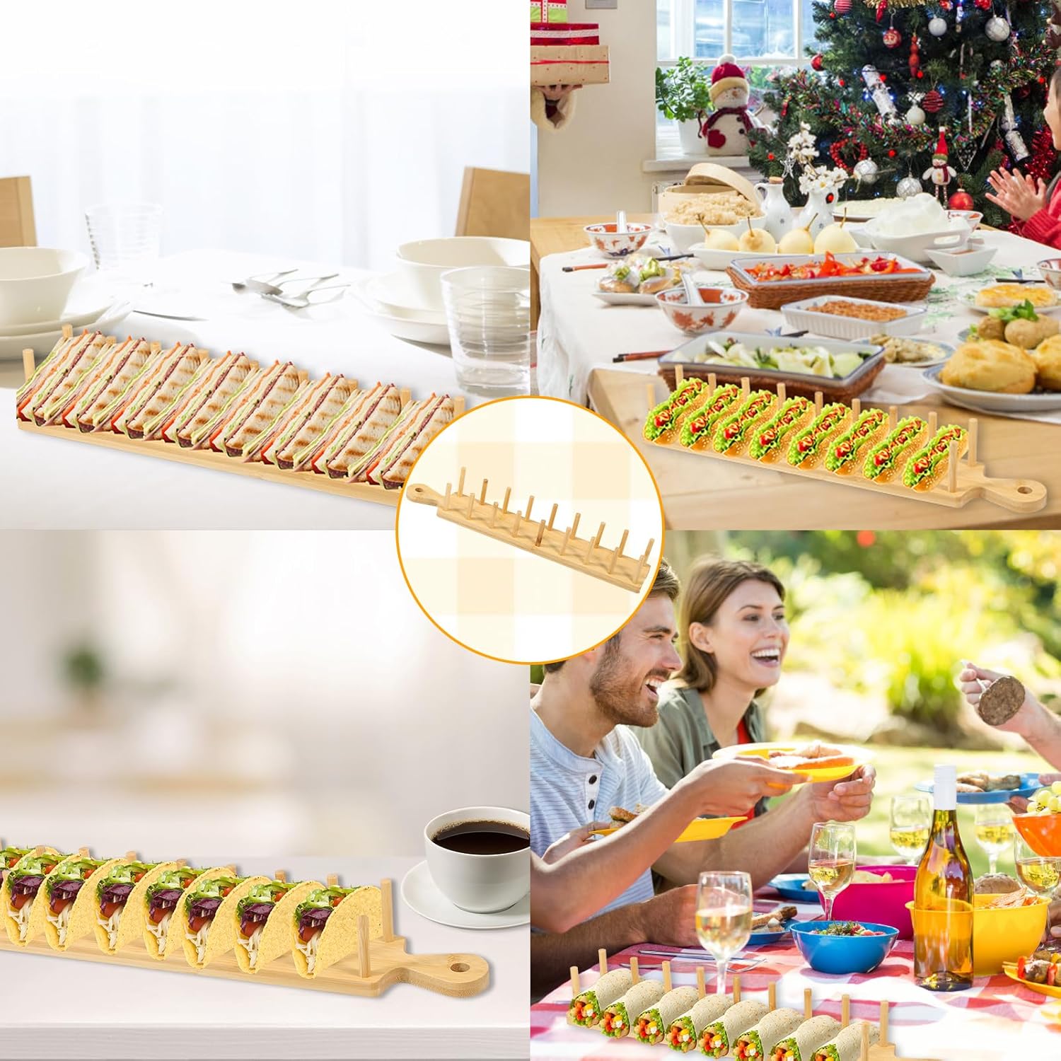 Safe Material:This taco tray is made of natural bamboo, which is not only suitable for direct contact with food, but also very sturdy and can withstand the weight of heavy fried tortillas without bending or breaking, ensuring long-term use.