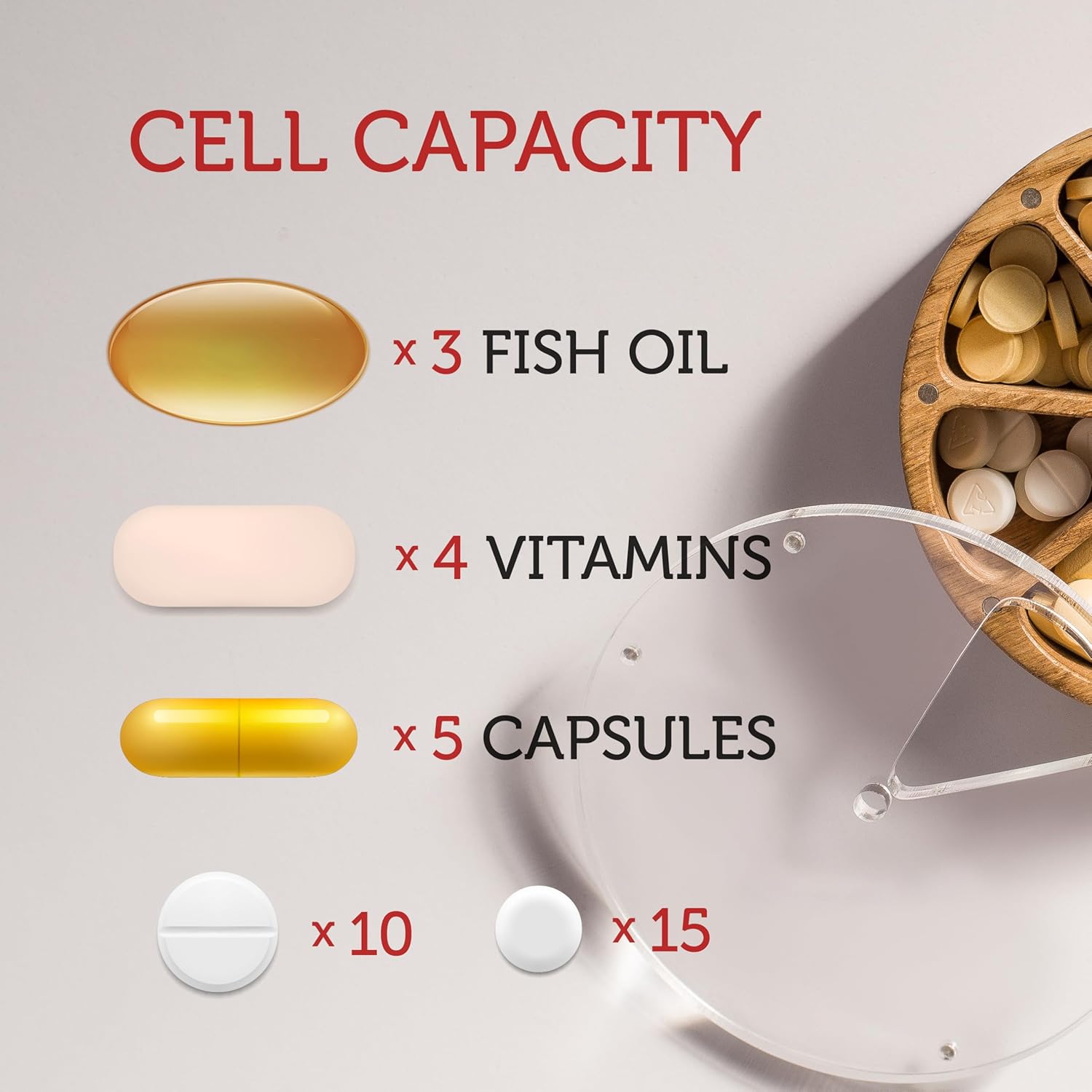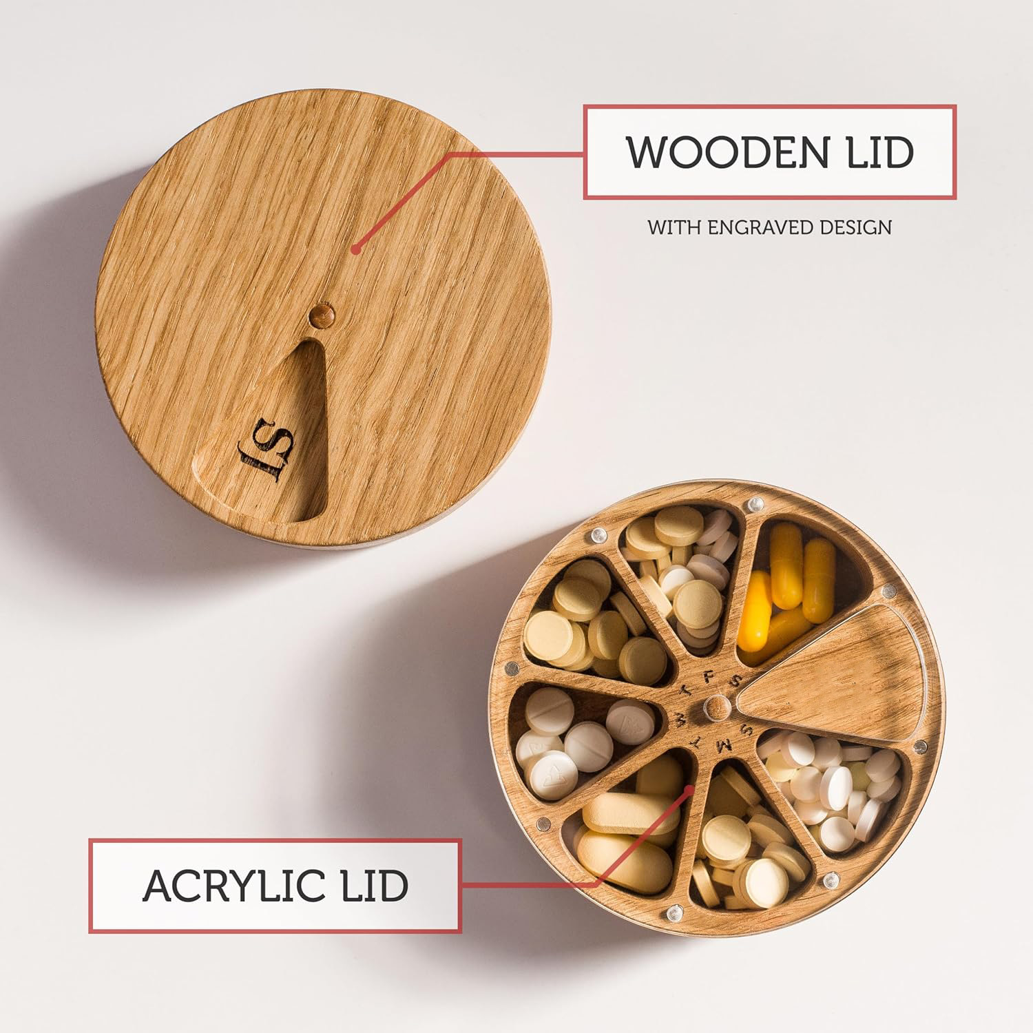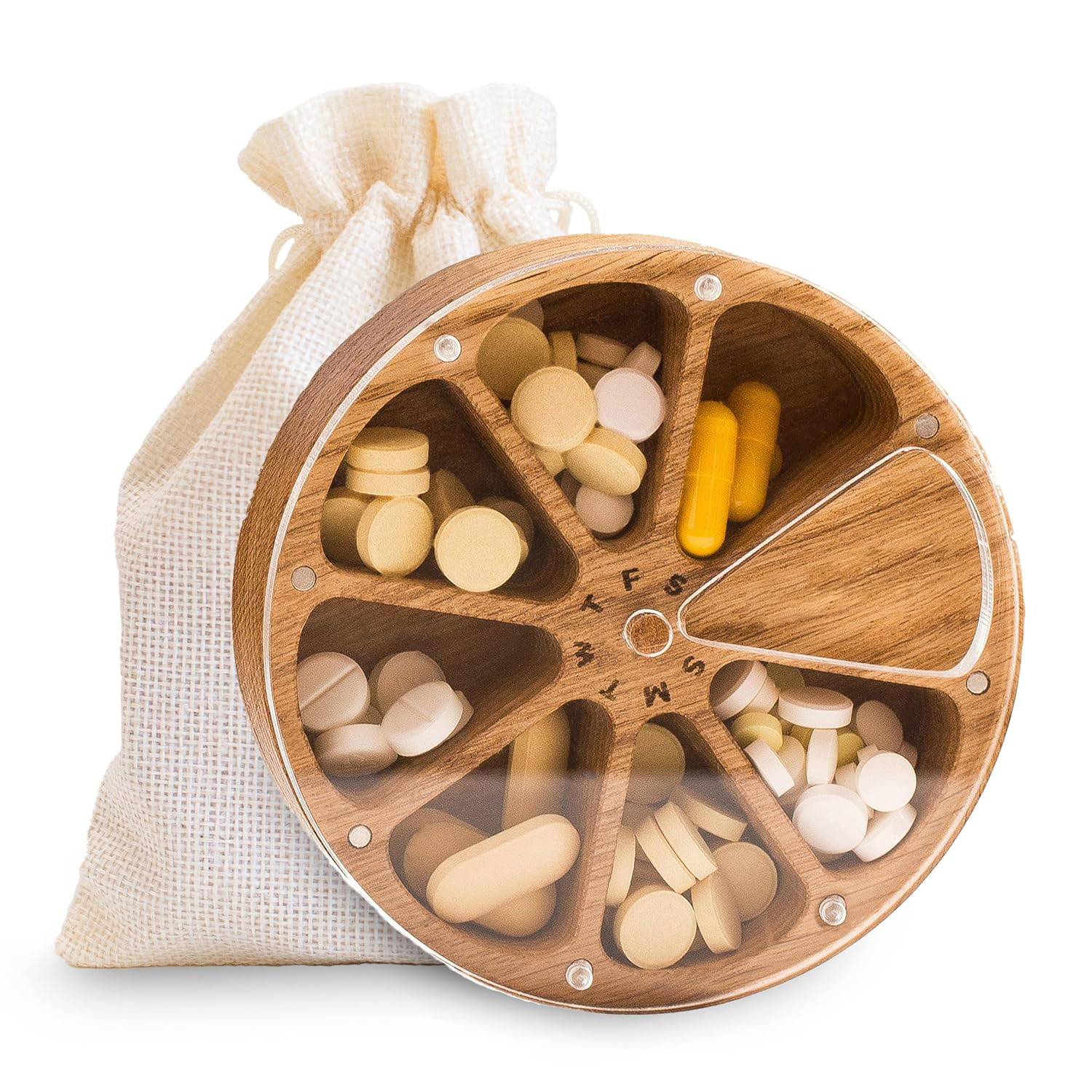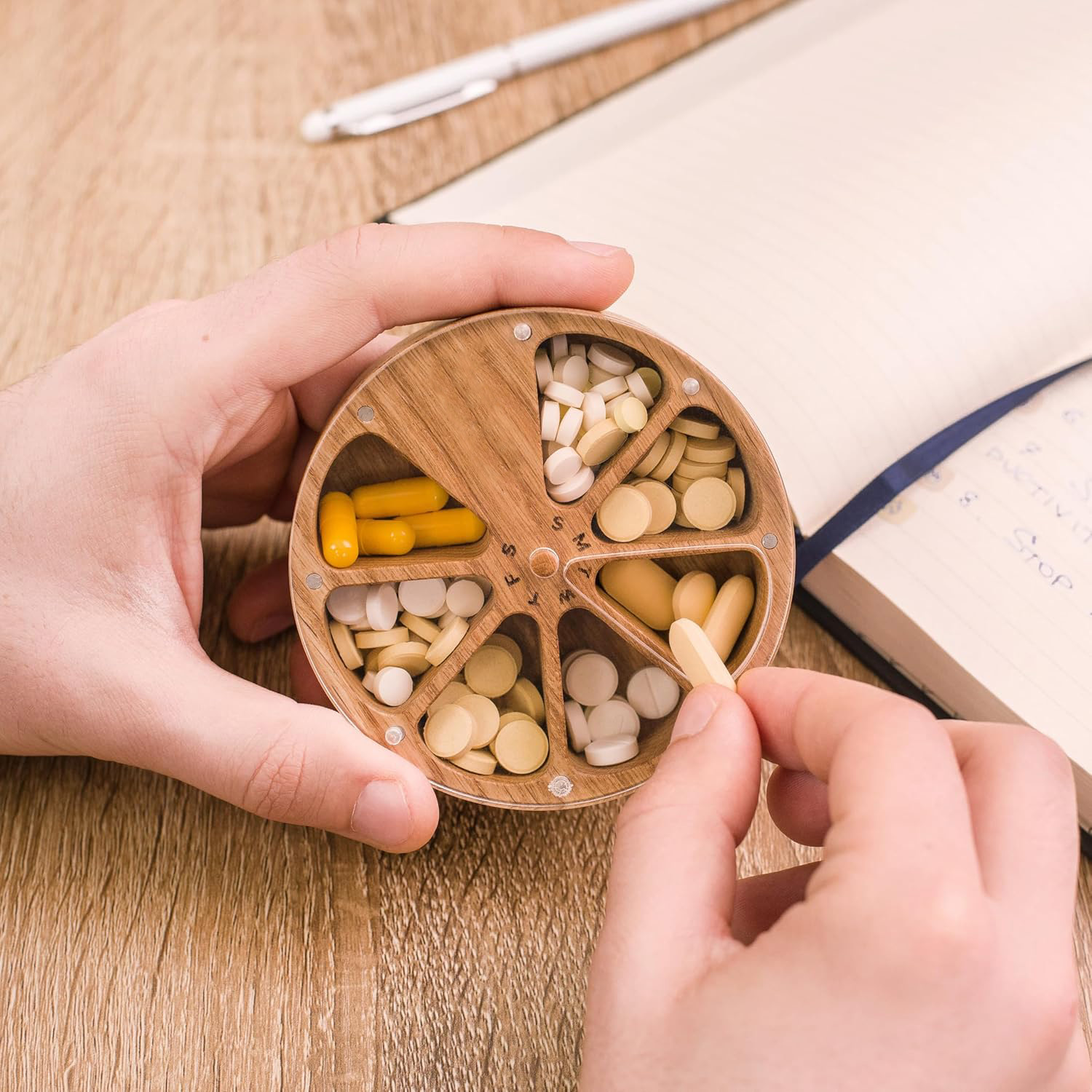 SIMPLICITY OF DAILY USE: This bamboo pill box, made from high-quality materials, ensures the safety and integrity of your medications. Our pill container, with multiple compartments for each day of the week, helps you stay organized and keep track of your medication schedule.
