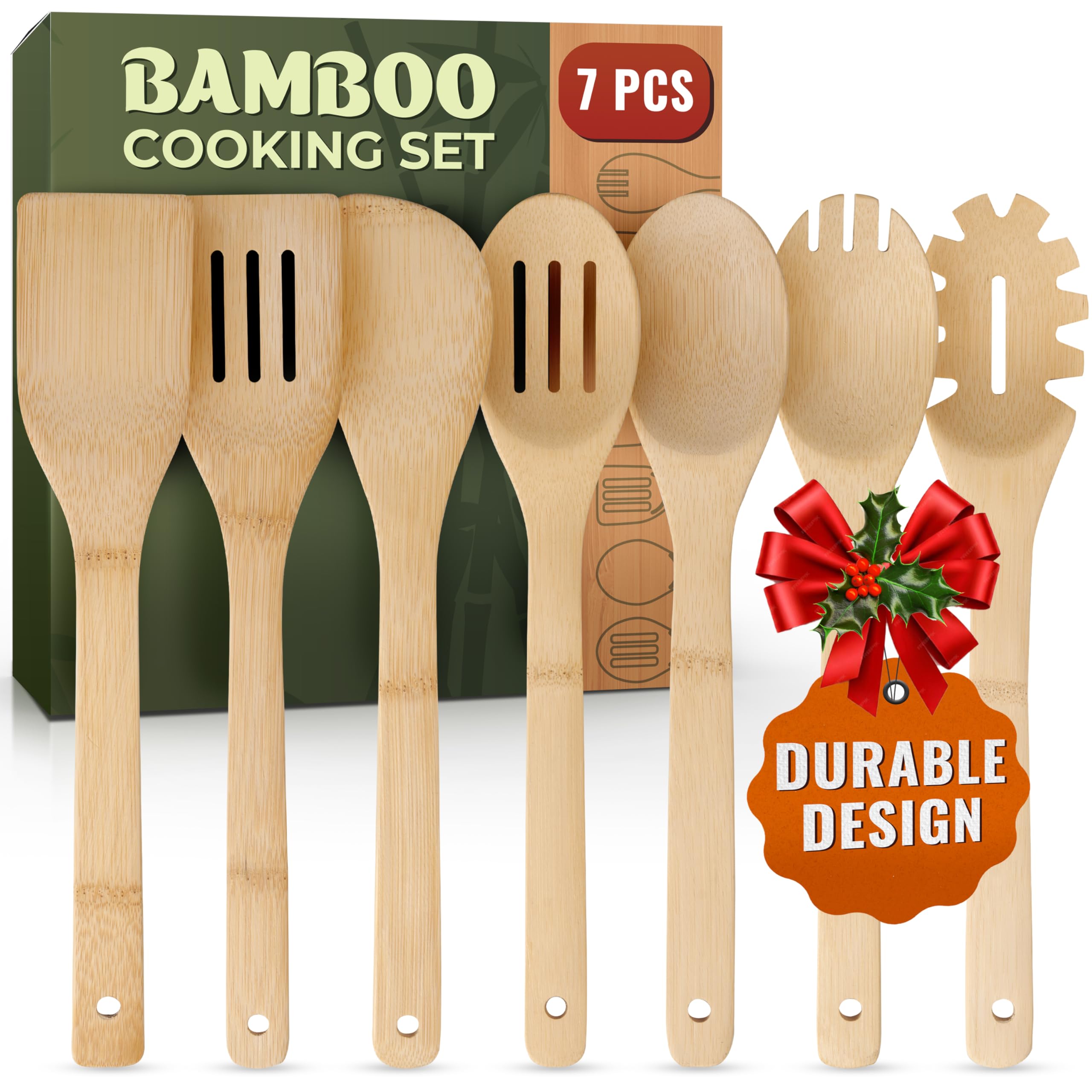 Complete Bamboo Utensil Set: This 7-piece bamboo utensil set is thoughtfully designed to cover all your cooking and serving needs. It includes a slotted round spatula, mixing spoon, slotted spatula, turner spatula, spaghetti spoon, frying spatula, and salad fork. Each tool is crafted for functionality and style, making them indispensable in any kitchen.