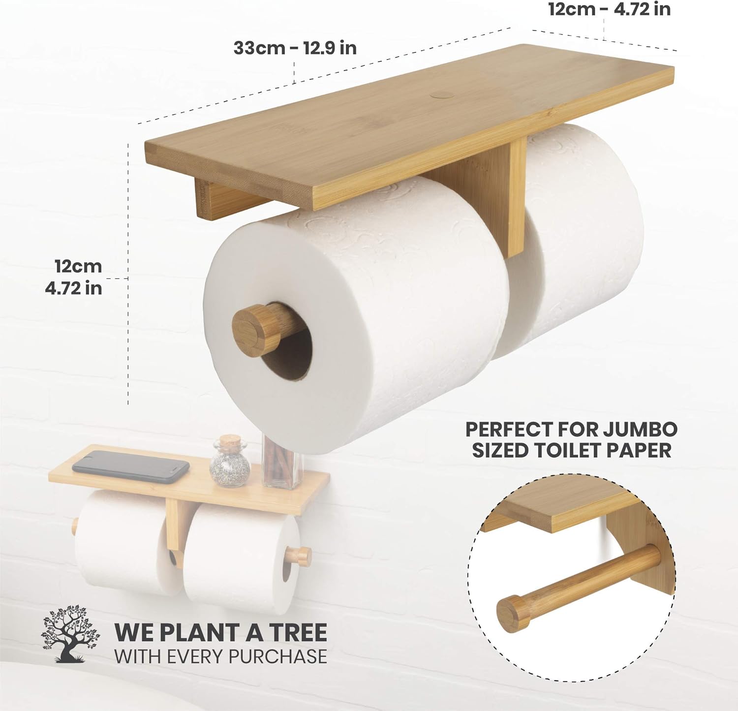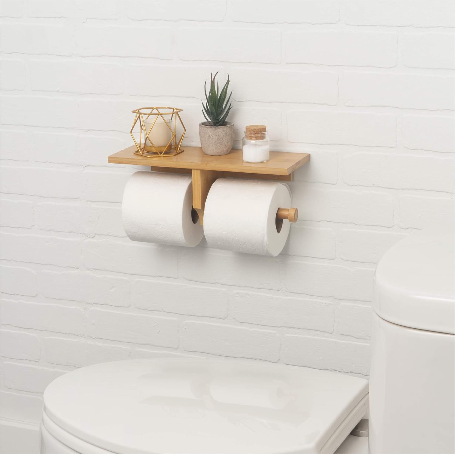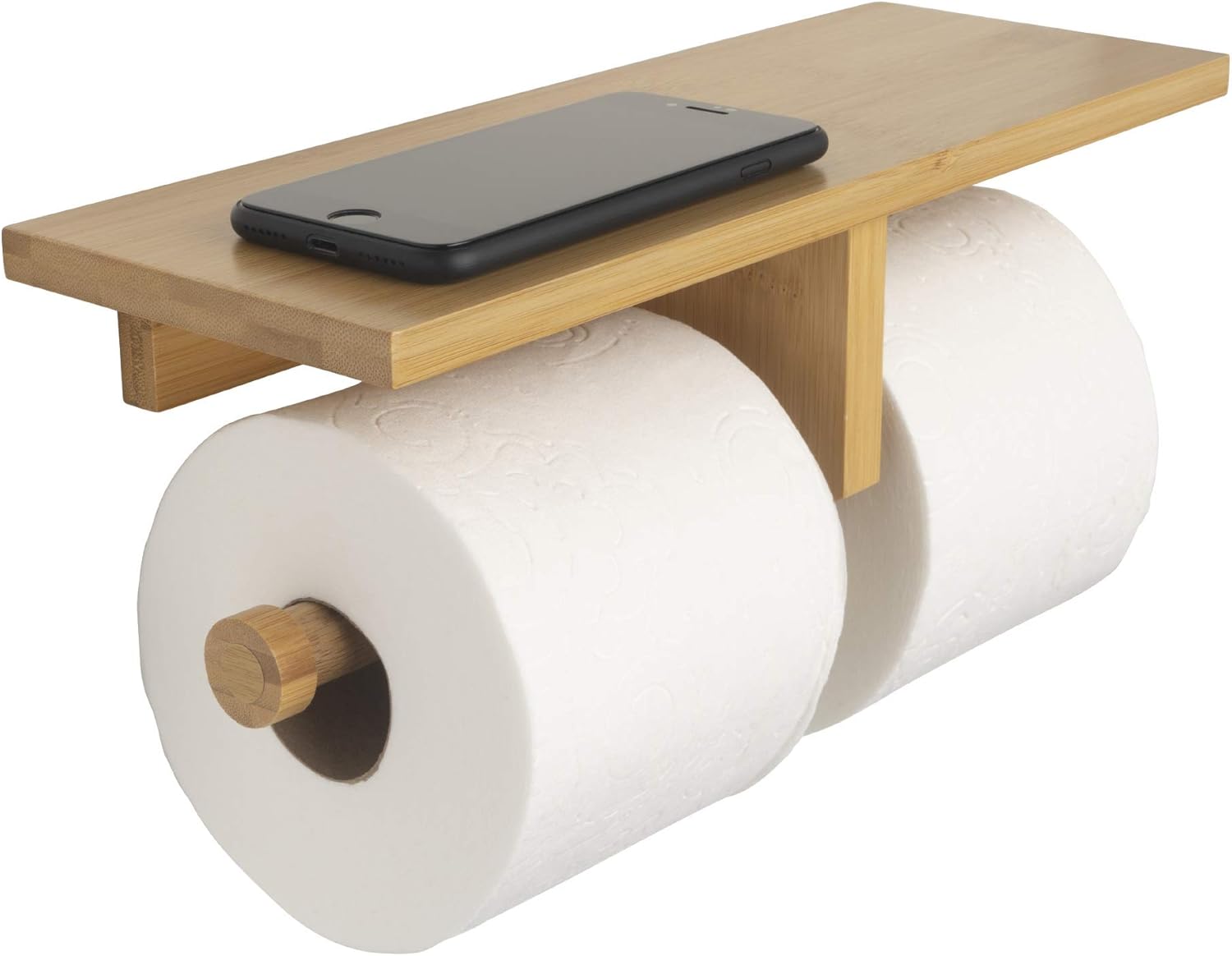 MULTIPLE ROLL TOILET PAPER HOLDER: This mounted holder can be loaded with 2 extra mega rolls at once, so you can worry less about running out at the worst times. You can even bulk stack multiple rolls on the wooden-like storage tray above the loading pegs
