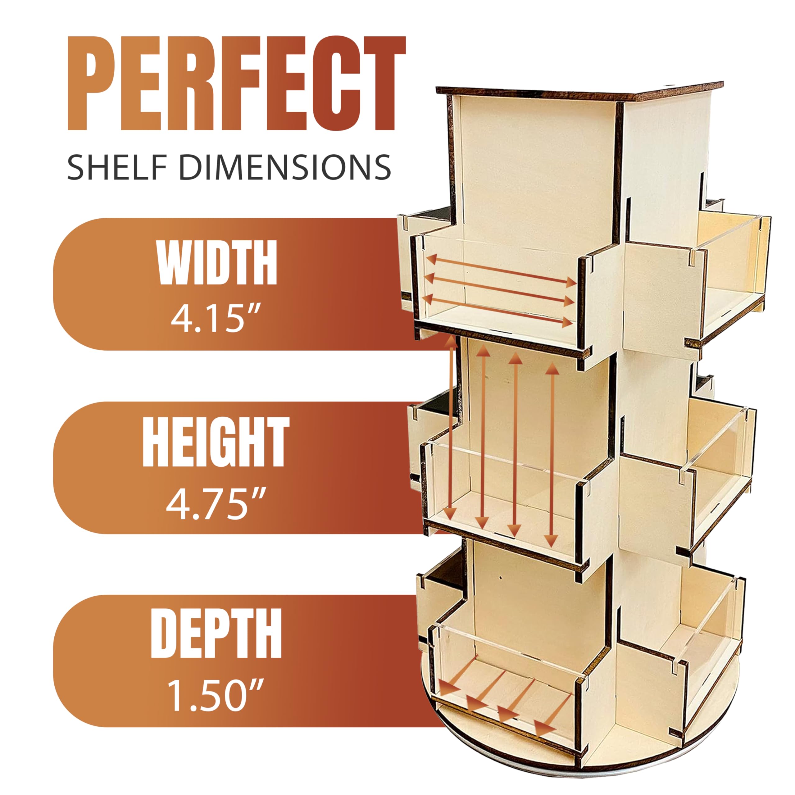 ROTATING STAND – Four sided table top display features a 360 degree rotating base to elaborately showcase your merchandise in an upright position, for a more detailed view, and easier access to products