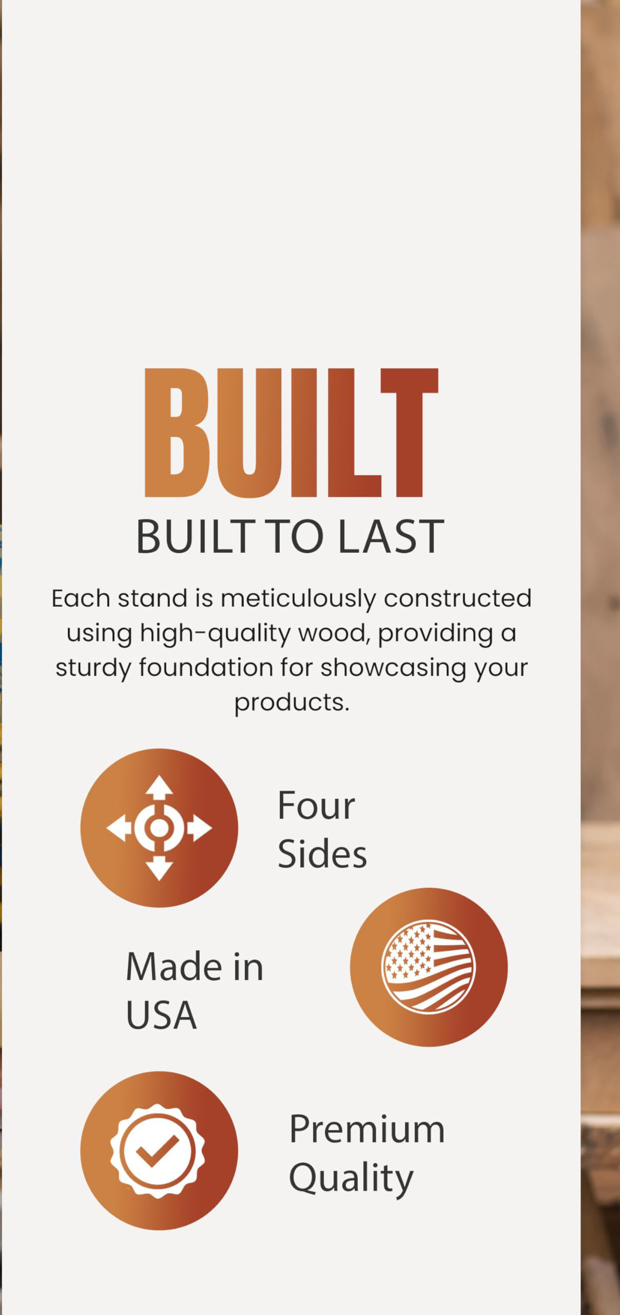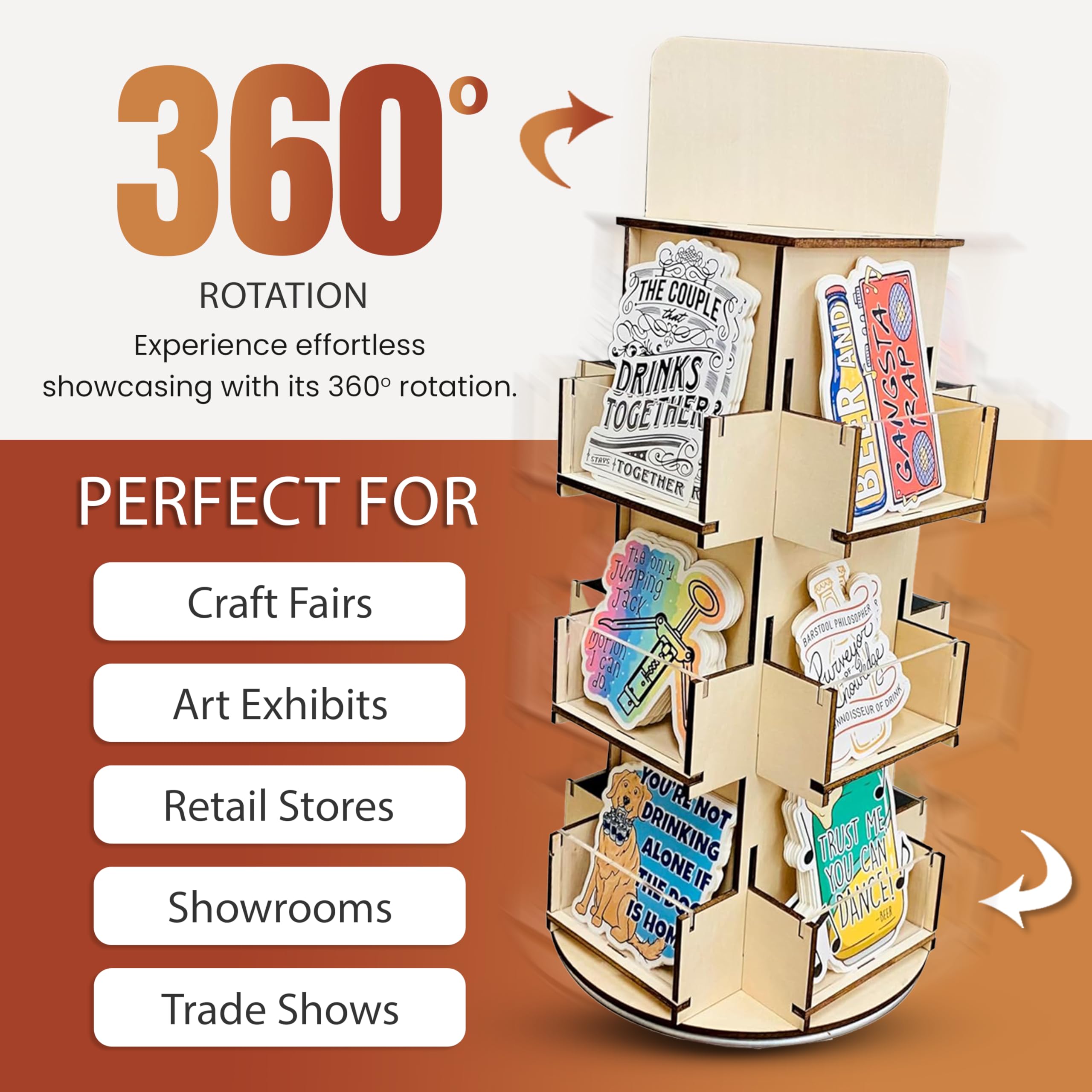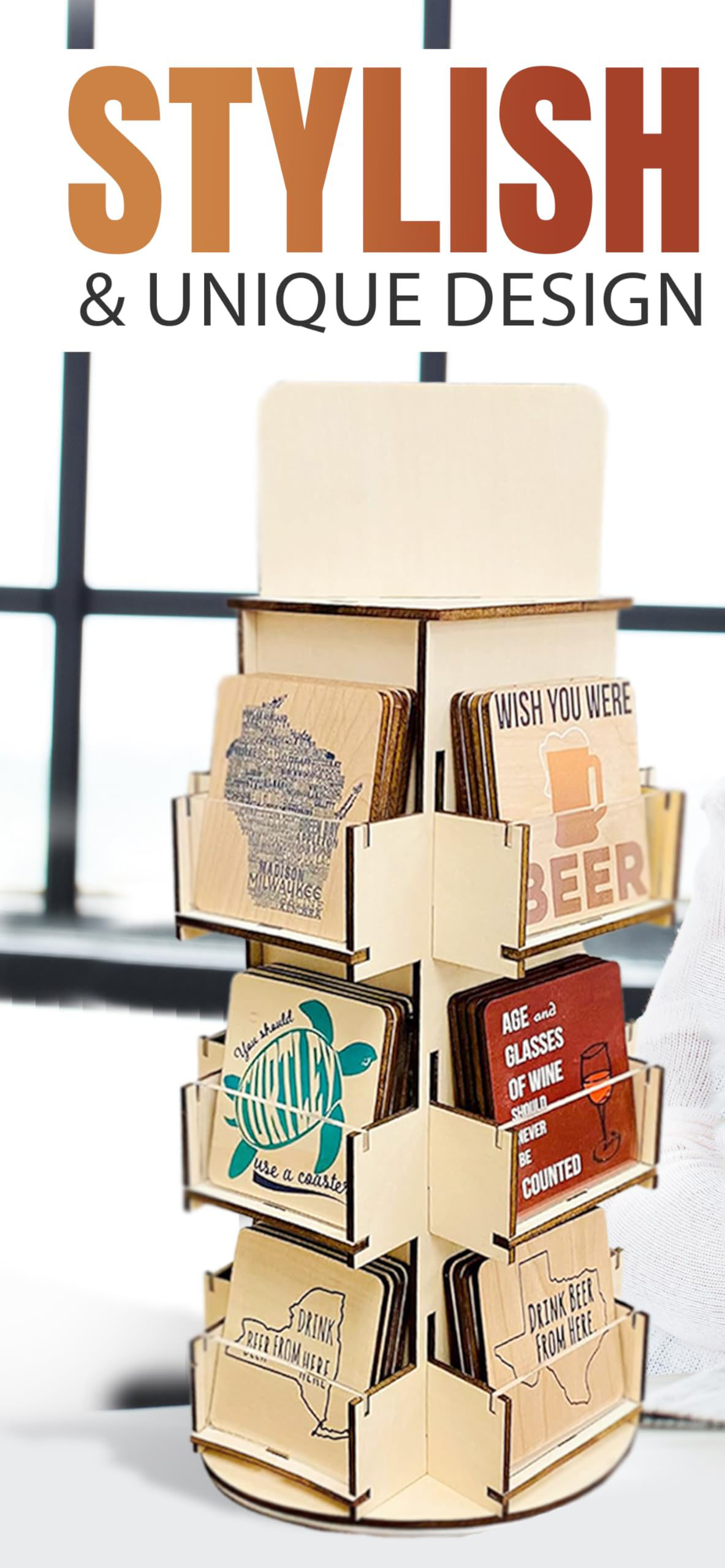 WOODEN DISPLAY ORGANIZER – Free standing, countertop stand keeps your merchandise organized and attractively displayed. Showcase decorative coasters, artwork, stationary, greeting cards, keepsakes, decal and collectables