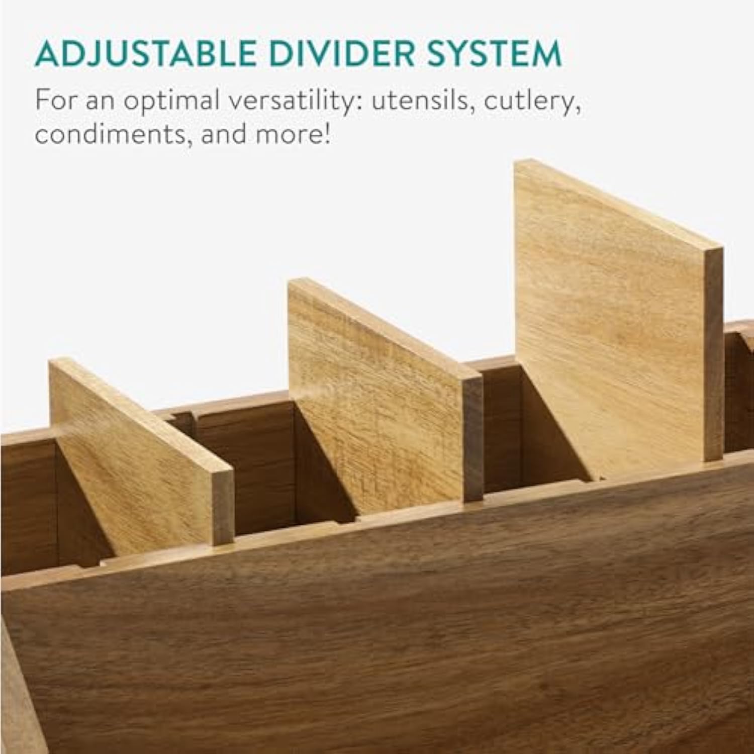 Versatile Organization: Keep your kitchen organized! Our wooden cutlery tray features an adjustable divider system for storing not only utensils and cutlery but also condiments, kitchen tools, and more.