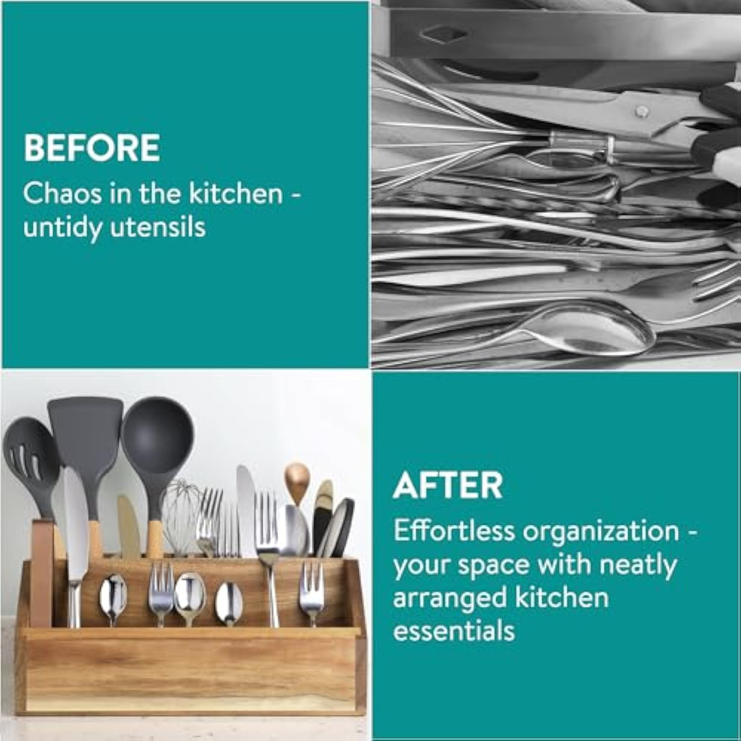 Elegant Farmhouse Decor: Add a rustic touch to your kitchen with an acacia wood large utensil holder. Its natural wood finish and farmhouse charm make it a stylish cutlery holder for table or countertop use.