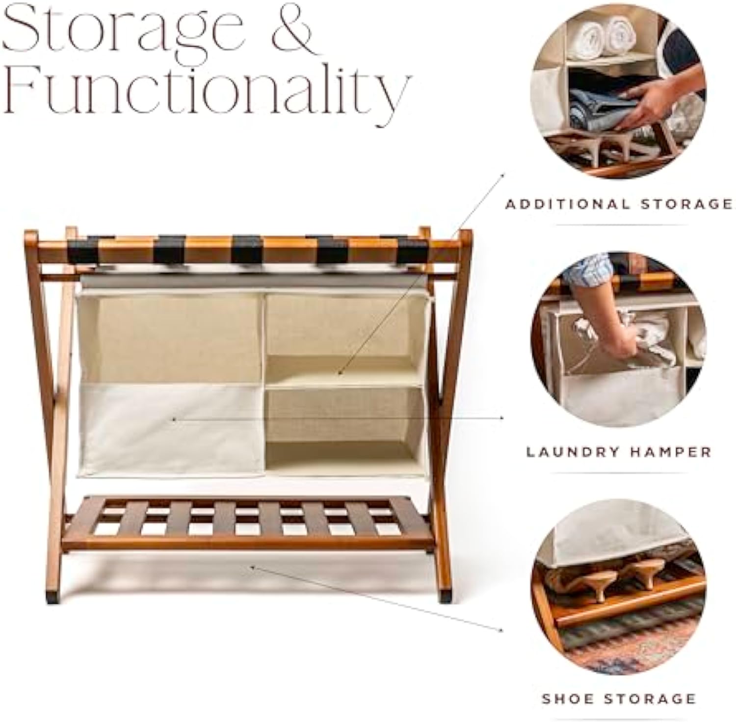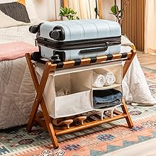 Has Extra Space for Shoes, Towels, and More: Standard luggage racks for suitcases don't have extra storage space, but this suitcase holder does; It comes with a versatile laundry hamper that doubles as a cubby for shoes, towels, and so much more