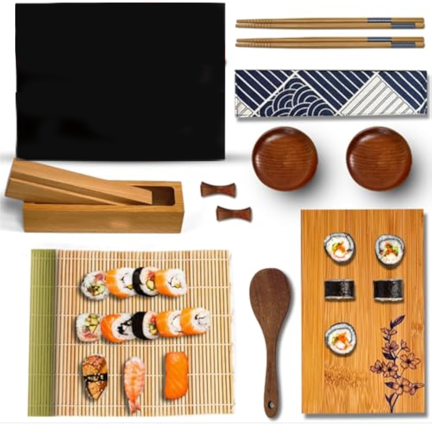 15-PIECE DIY SUSHI KIT – Whether you’re throwing a SUSHI PARTY for friends at home or making an INTIMATE DINNER FOR TWO, our sushi roll up kit includes ALL THE TOOLS YOU NEED to make traditional sushi: MAKI PRESS, Woven Bamboo SUSHI ROLLING MAT, Rice Paddle, ENGRAVED SUSHI TRAY, 2 Chopsticks Sets, 2 CHOPSTICKS Holders, and 2 Sauce Bowls, plus an elegant Storage Bag