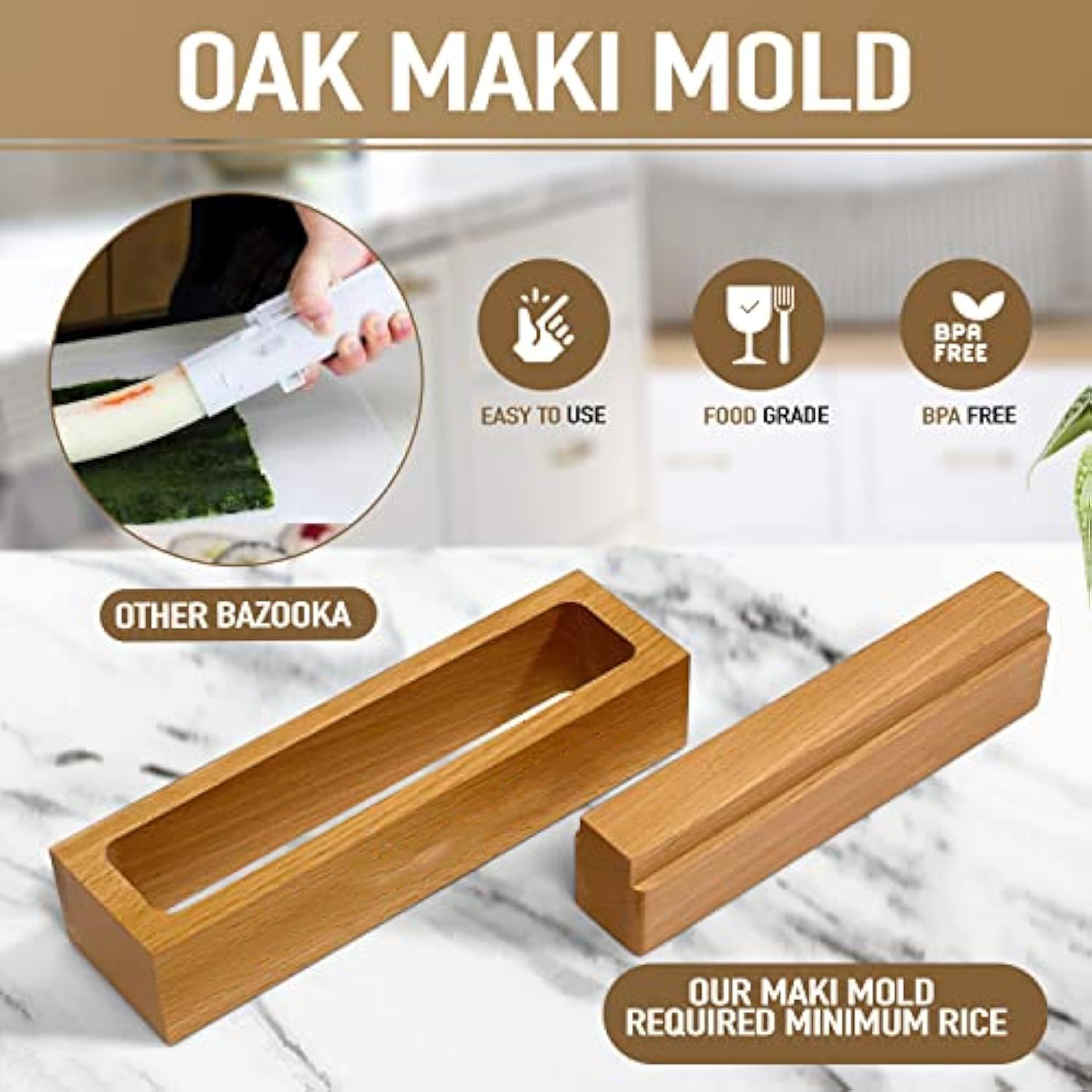 OTHER SUSHI MAKING SETS with plastic bazookas are DIFFICULT TO USE and require too much rice, robbing your sushi of its DELICIOUS FLAVOR. Our oak wood maki sushi press is EASY & STRAIGHTFORWARD to use, and requires the CORRECT AMOUNT of rice for THE IDEAL PORTION SIZE. Simply fill the wooden frame with your sushi rice fillings of choice and press down to shape into THE PERFECT SUSHI ROLL