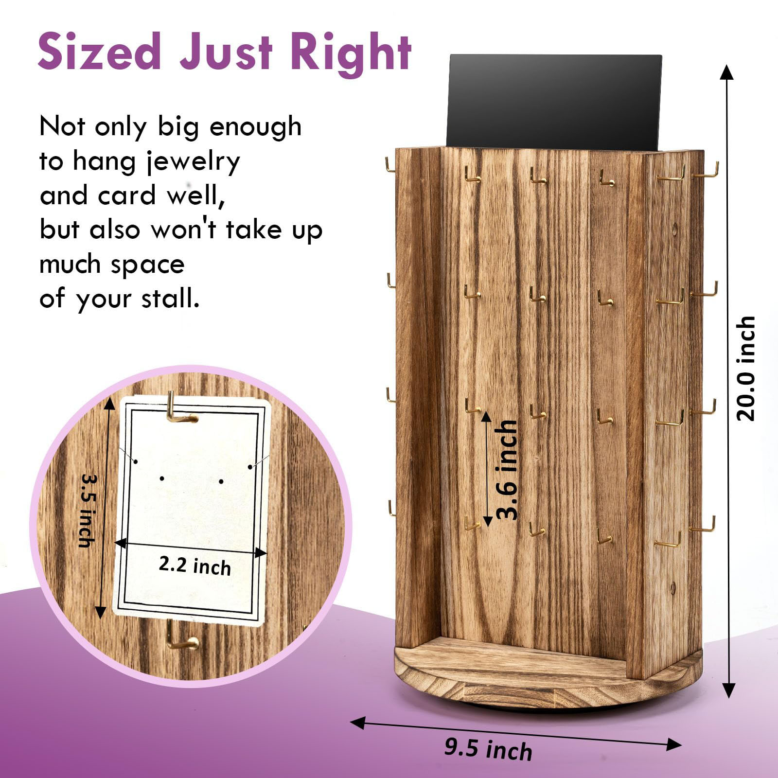 Enhanced Jewelry Display for Vendors: Rotating wooden earring display stand offers a mesmerizing way to showcase earring, keychain and bracelet. Featuring 40 hooks provides ample room to exhibit a diverse selection of bracelet and captivate prospective customers. Dimensions after assembly 9.5"D x 9.5"W x 20"H