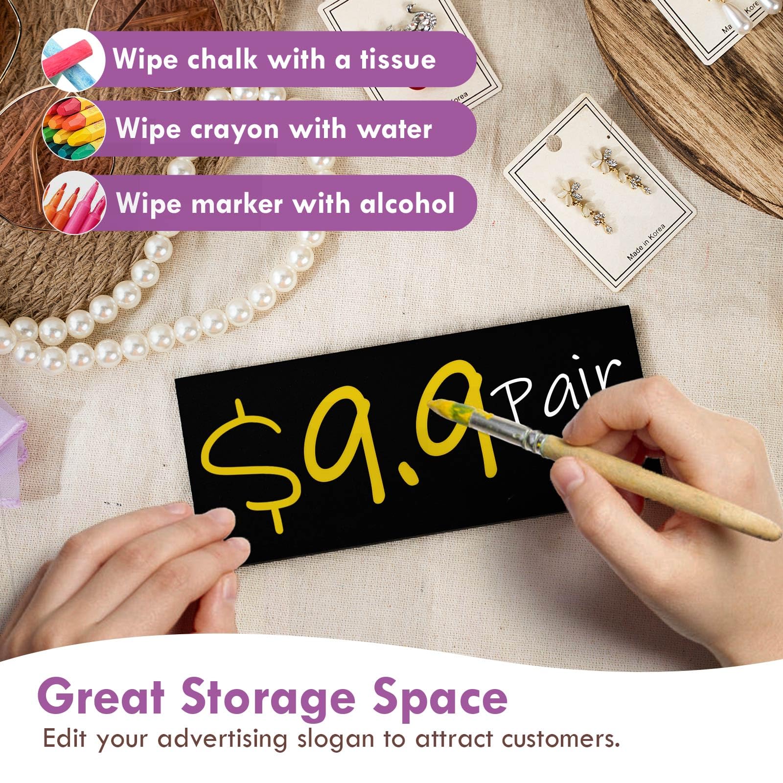 Design Advertising Slogan: The blackboard of the display stand is where your creativity comes into play, whether it's marking prices or making unique designs for each holiday easy to promote your jewelry and create a lasting impression on potential buyers. It's suitable for crayons and simply wide with a damp cloth