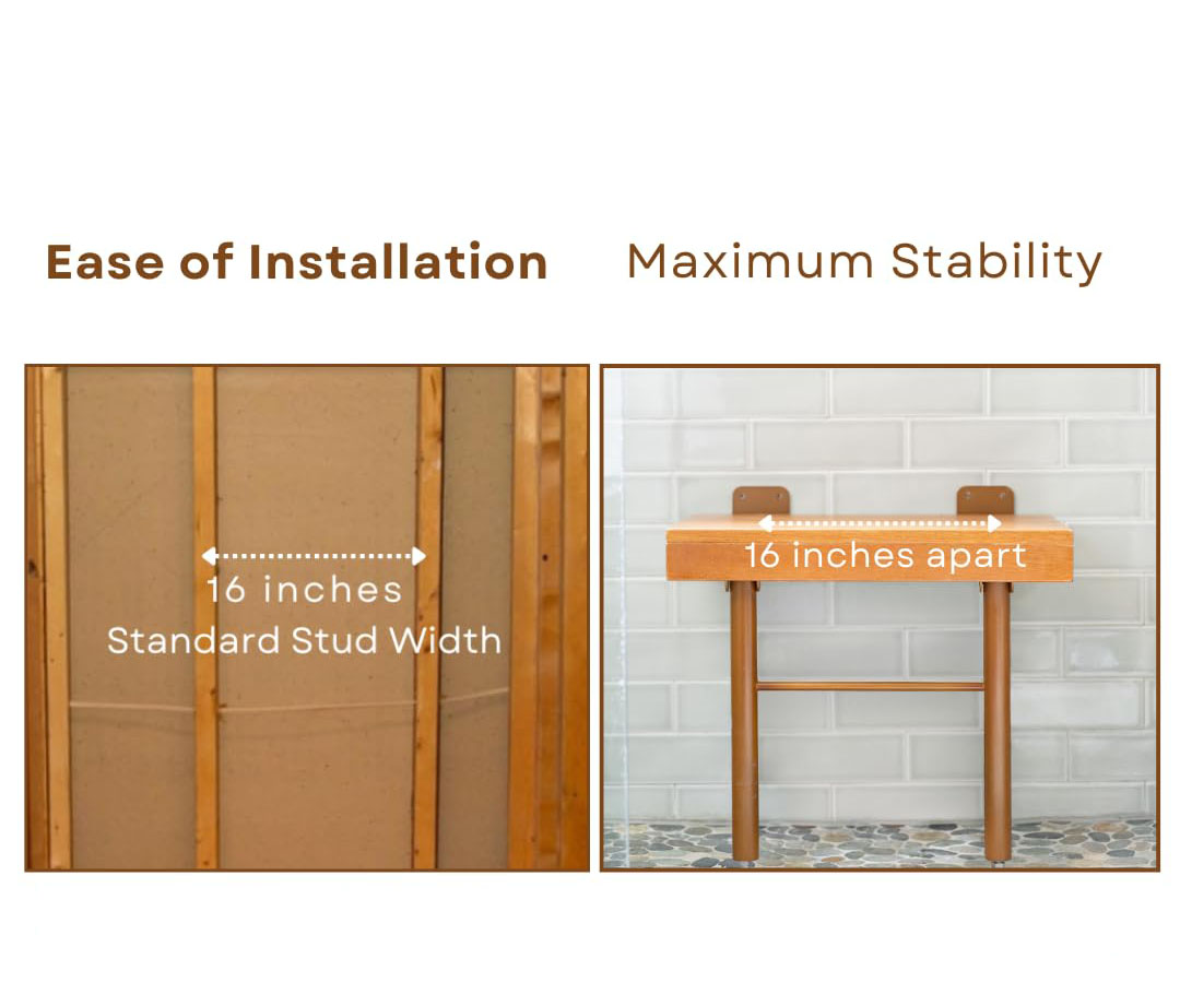 Safe & Reliable: Our teak shower counters have mounting holes, spaced 16 inches (about 40.6 cm) apart, and can be easily attached to studs on the wall. Our wall-mounted shower seats to prevent the feeling of tipping over. You can rest assured that your foldable shower seat won't go anywhere.