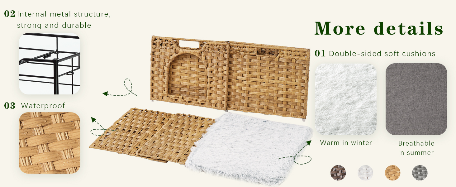 Premium Materials: The cat caves for indoor cats are handwoven from durable synthetic rattan material, makes the cat scratch house soft and cozy. One double-sided cushion makes the big cat bed breathable in summer and warm in winter, ideal for all seasons