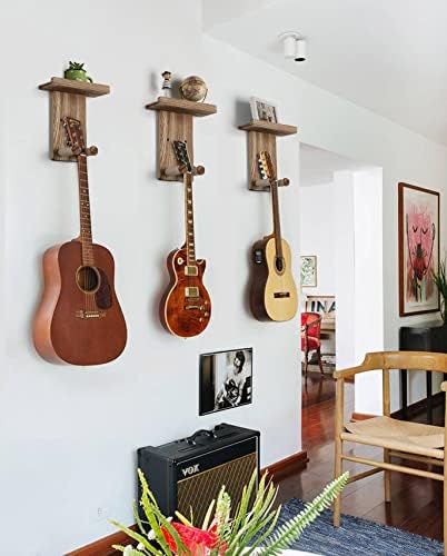 Guitar Wall Holder 3 Pack Solid Wood Mount with Pick Shelf