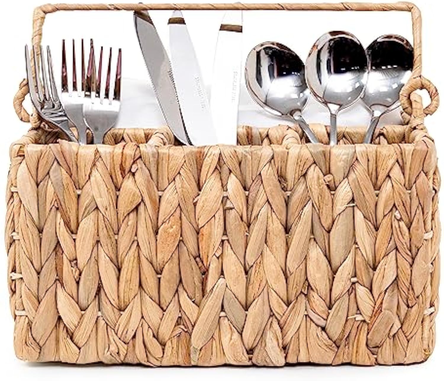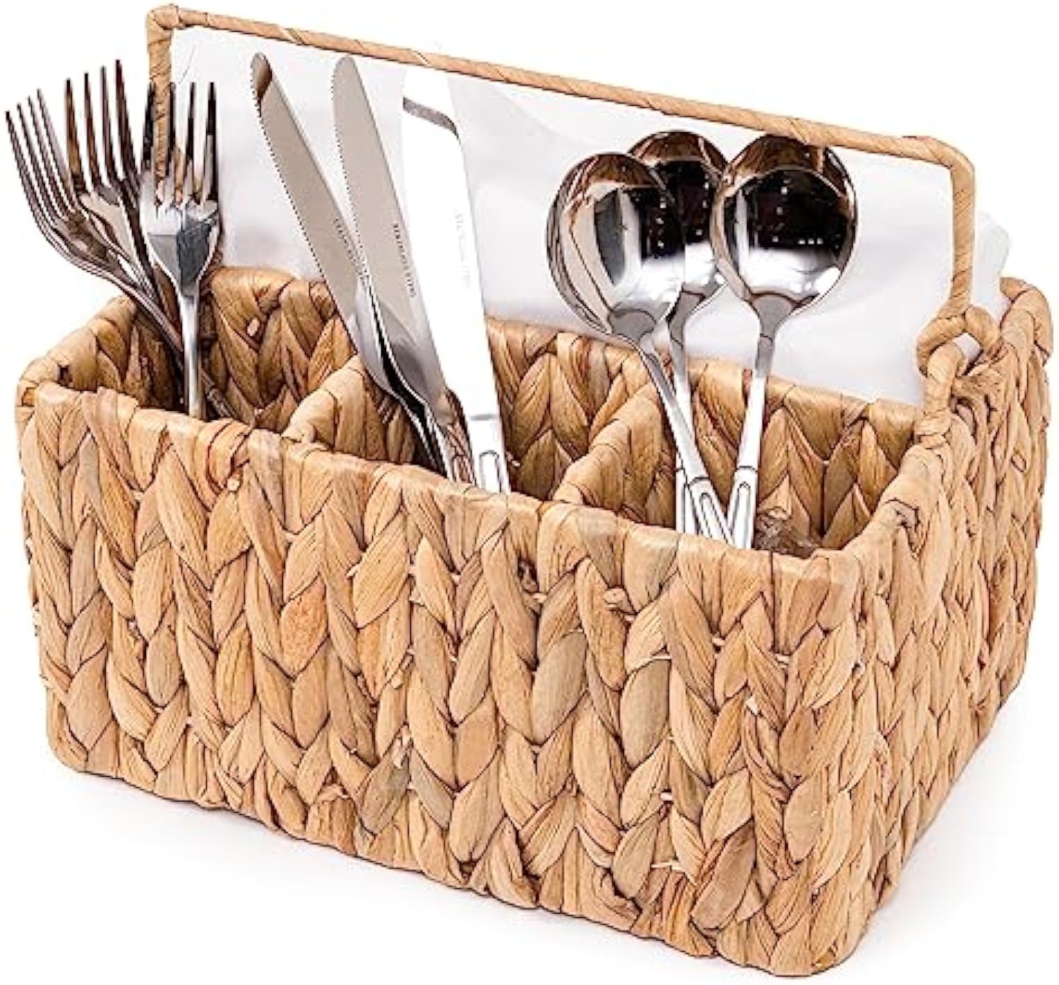 Handwoven Wicker Utensil Caddy with Handle – Water Hyacinth Cutlery Organizer for Countertop, Kitchen Table, or Outdoor Dining – 4 Compartments, Rustic Flatware Holder China Products Manufacturer