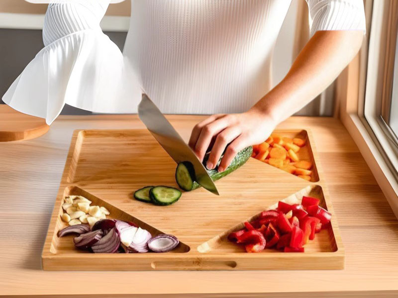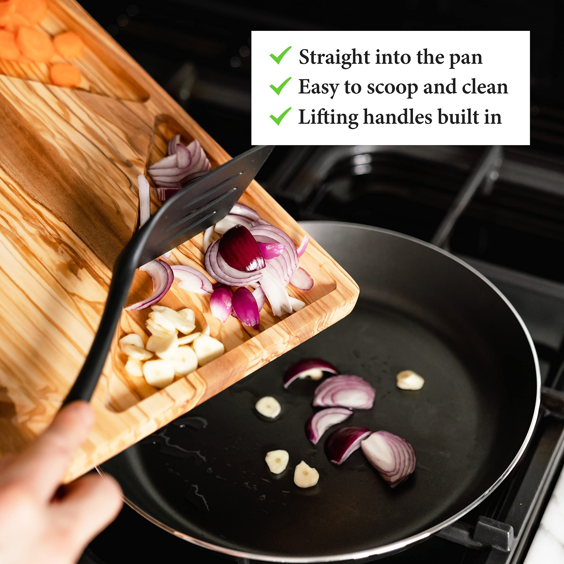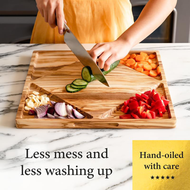 LESS MESS – Our upmarket wood cutting board has carved-in containers for storing chopped foods to save you from having bowls everywhere. Tapered edges allow you to easily scoop food into the pan.