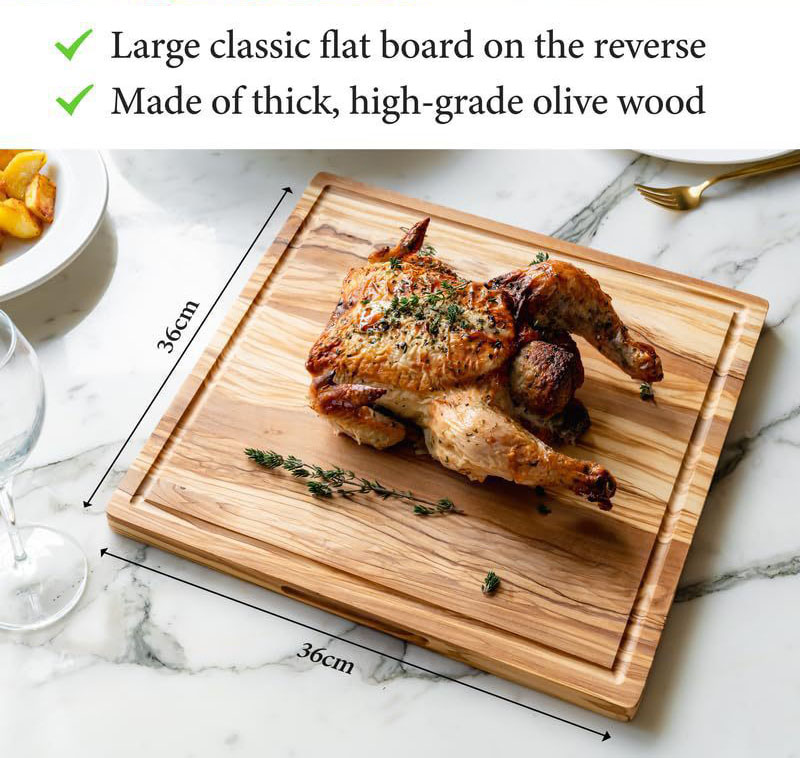 MULTIPURPOSE – The reverse side of our cutting boards for kitchen has no containers, making it perfect for carving and serving larger foods like roasted meats and bread loaves. A juice groove around the edge will prevent liquids from spilling over.