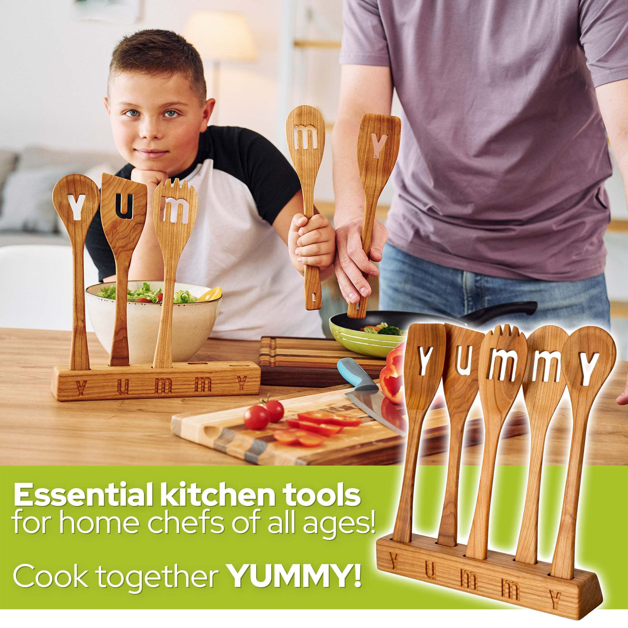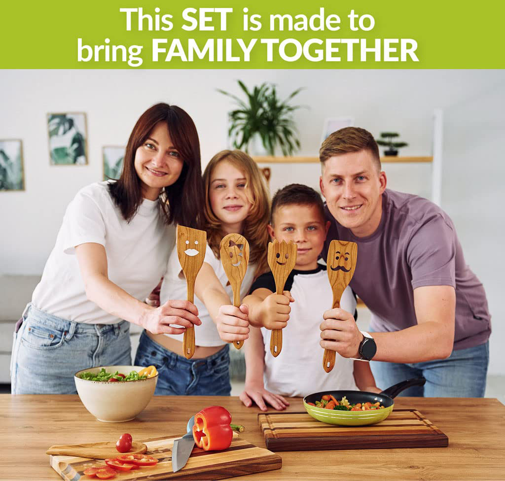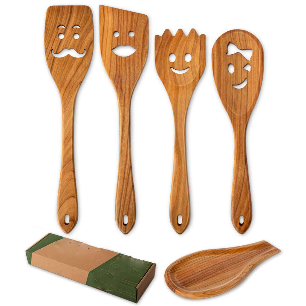NEW RELEASE! New wooden product! SOLID CHERRY WOOD! Set of 5 multi-functional Spurtles: 11.8 Inches. Kitchen utensils for all true cooking lovers! Lovely faces cut outs are professionally designed