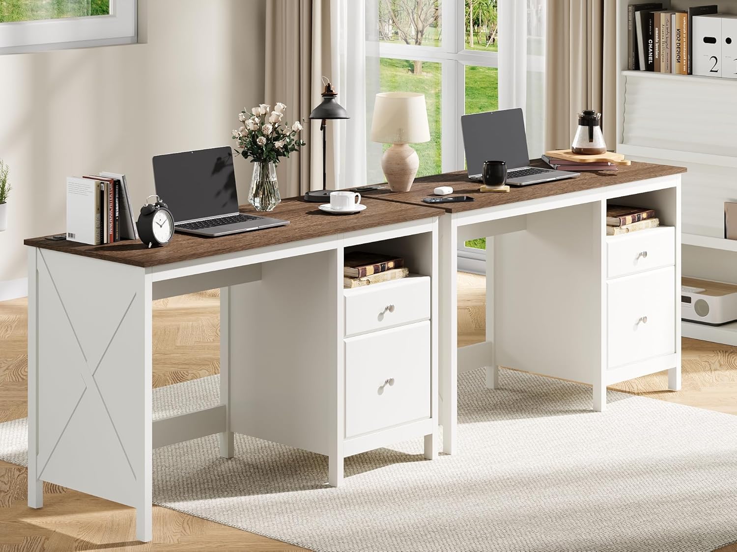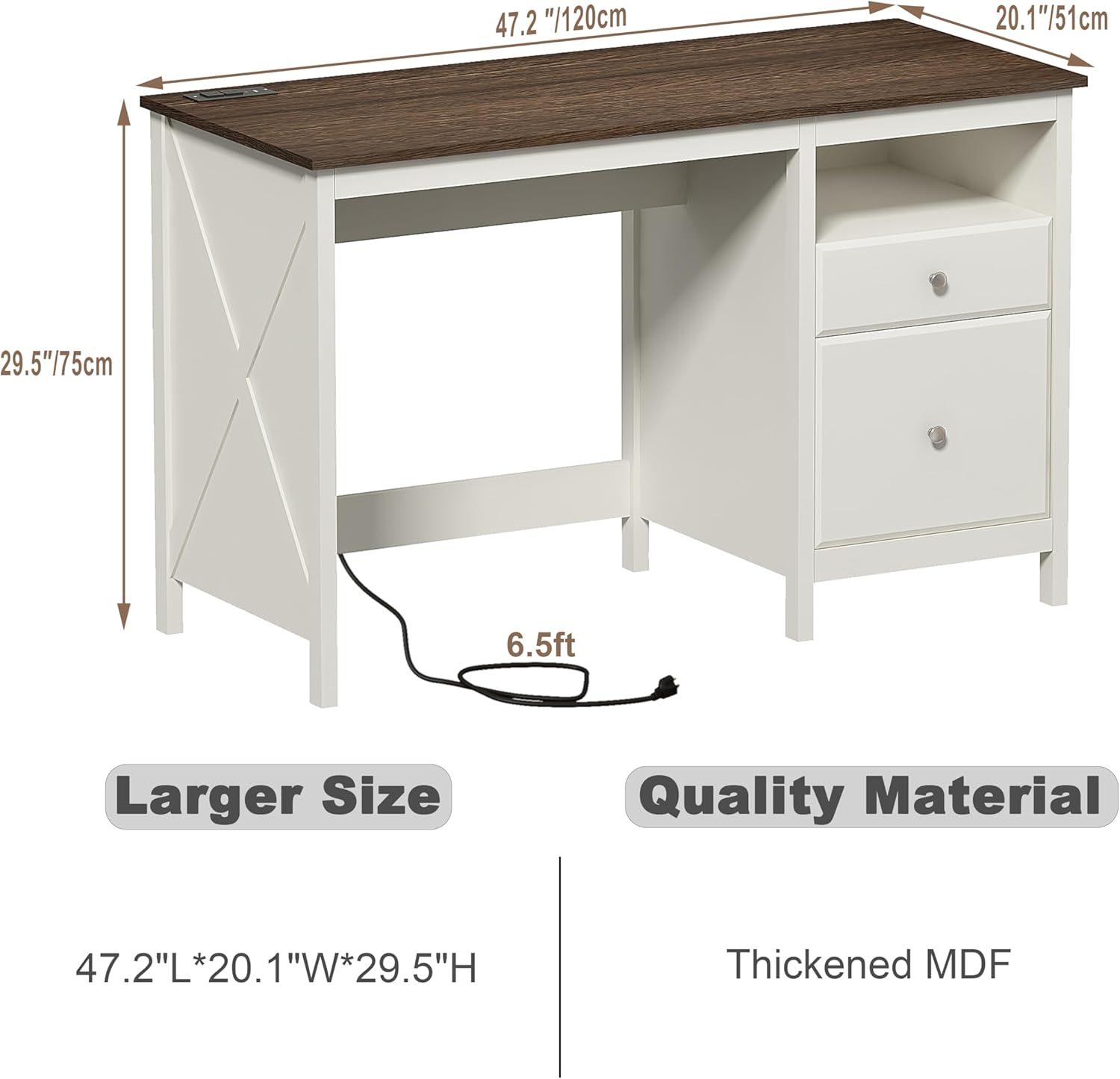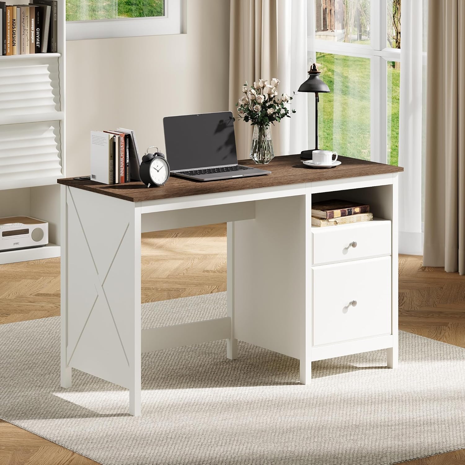 Charming Farmhouse Versatility:Featuring a soft white finish, this desk blends rustic farmhouse charm with modern functionality. It can serve as a computer desk, writing table, or vanity, fitting seamlessly into study rooms, bedrooms, or home offices. The warm brown and clean white color scheme creates a classic, enduring look.
