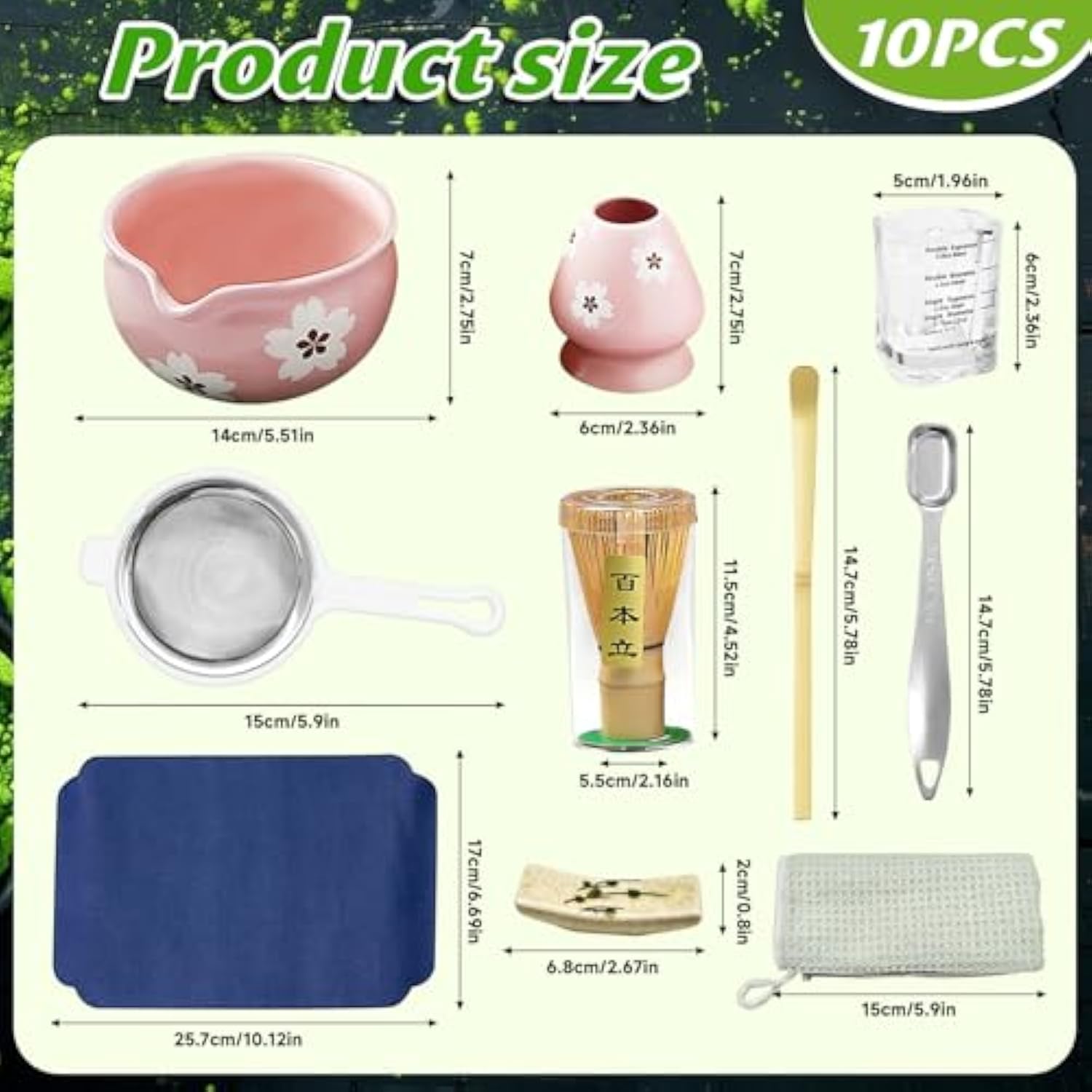 COMPLETE SET: Traditional matcha tea ceremony set includes a handcrafted whisk, ceramic bowl, bamboo scoop, fine mesh sifter, and whisk holder