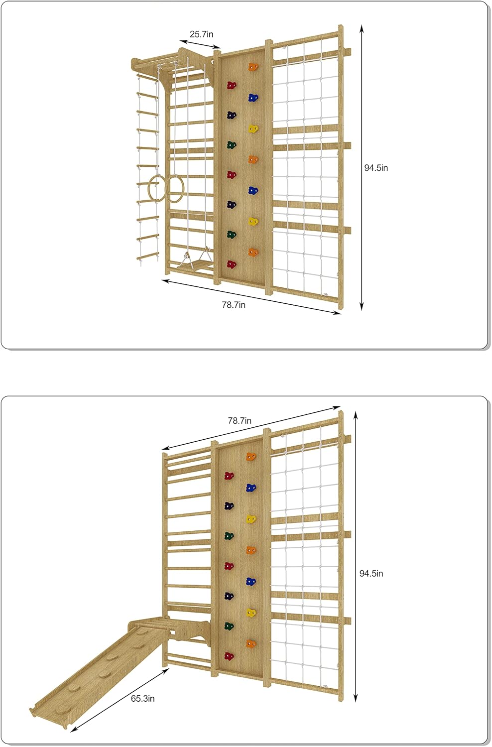 Versatile Climbing Gym: Explore countless adventures with this all-in-one indoor wooden jungle gym! Designed to spark exploration and play, it boasts a trapeze swing, rope ladder, rock wall, ramp climber, slide, pull-up bar, and more. Keep kids engaged and active for hours!
